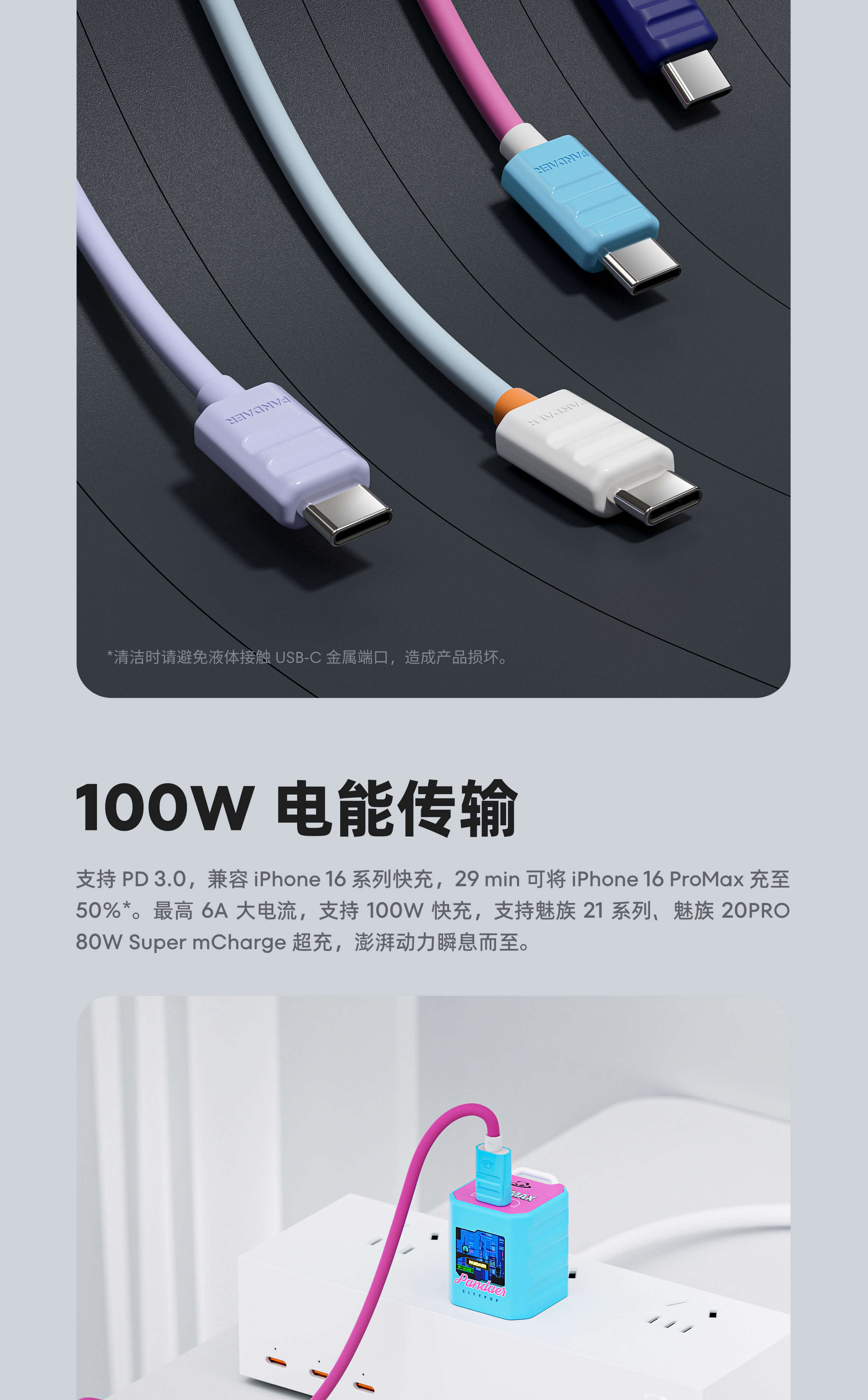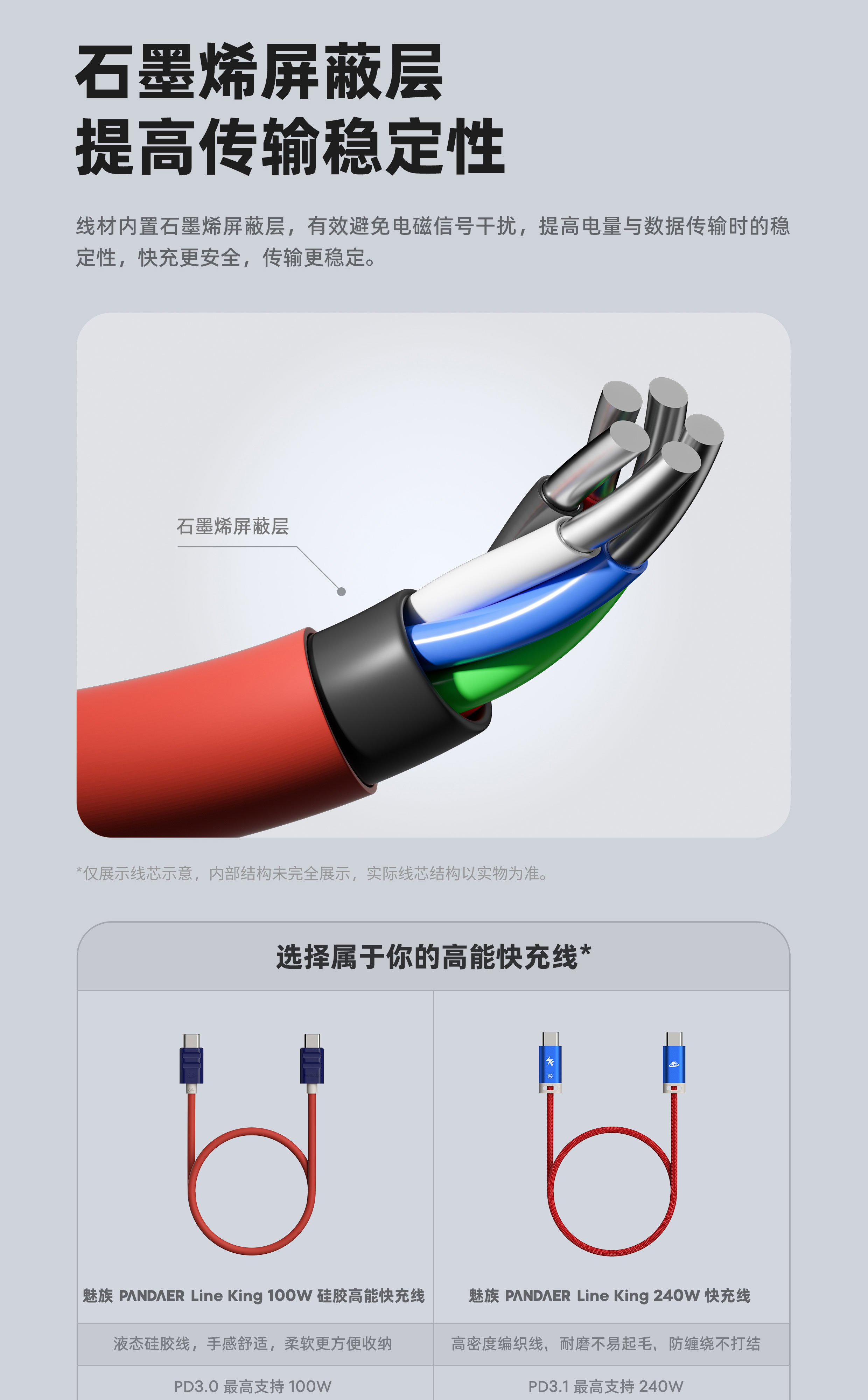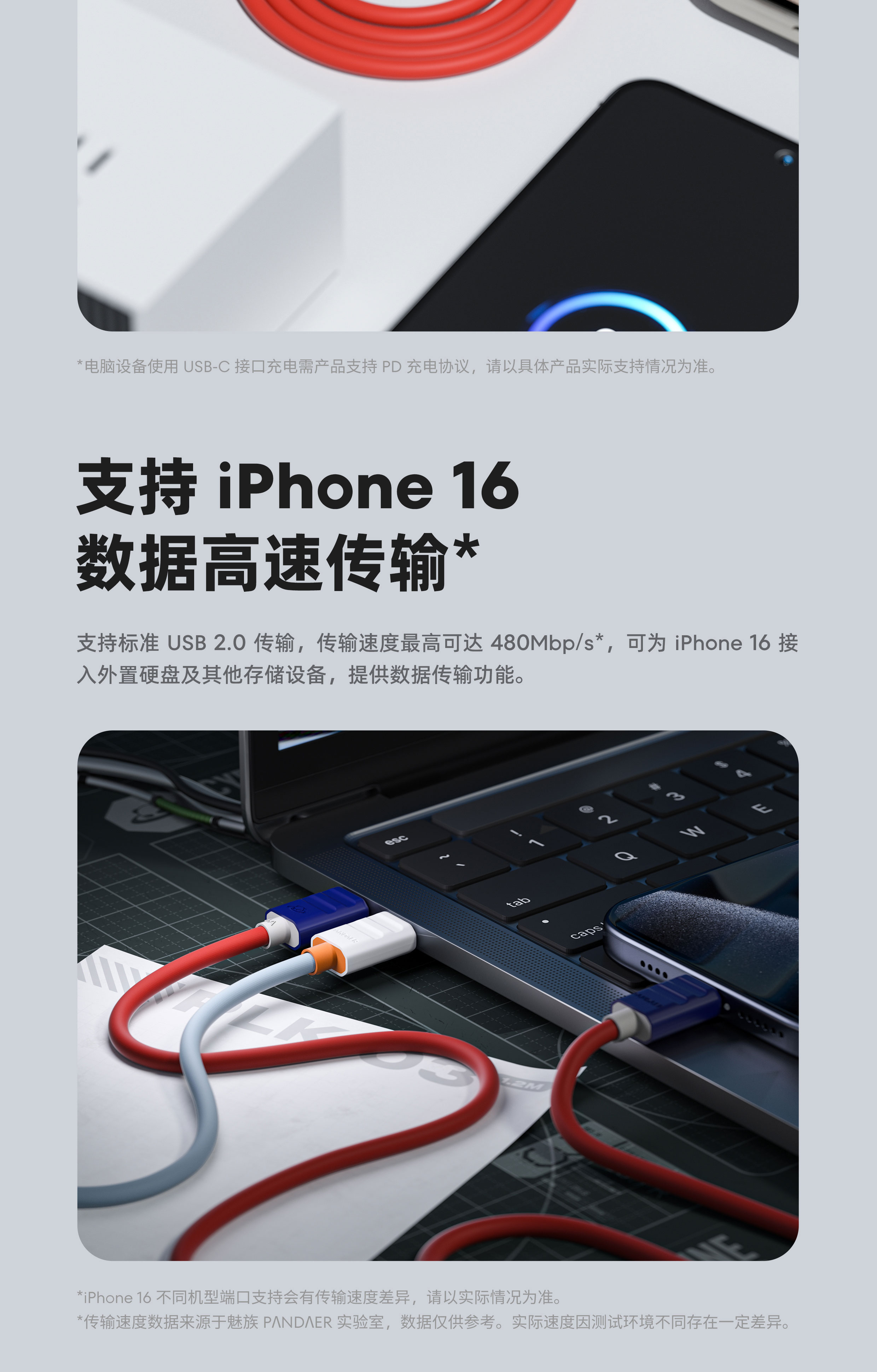支持魅族 21 系列快充 | 支持 iPhone 16 系列 USB-C 传输 | 100W 电能传输 | 石墨烯屏蔽层 | 液态硅胶柔软线身 | 太空电瓶外壳设计