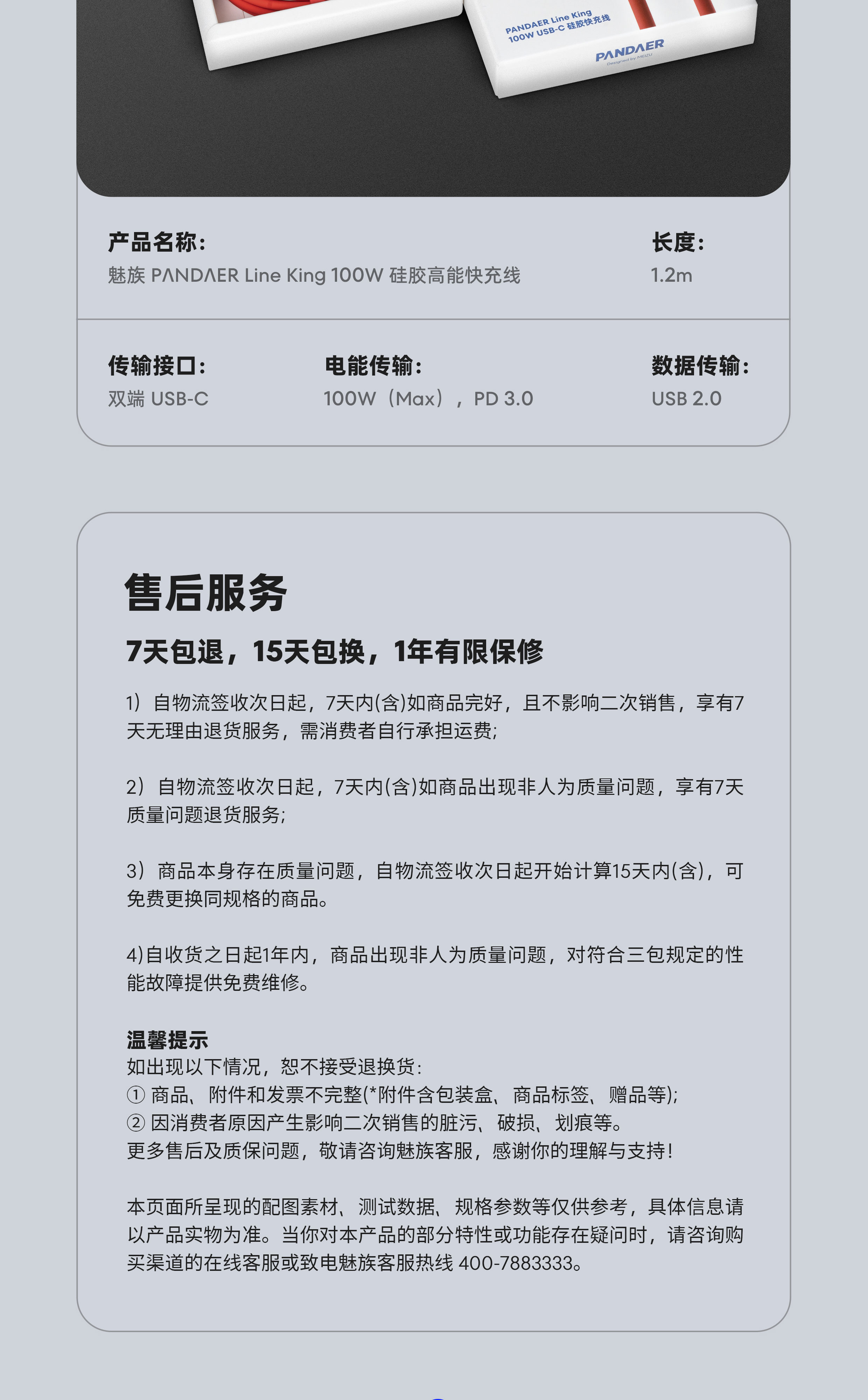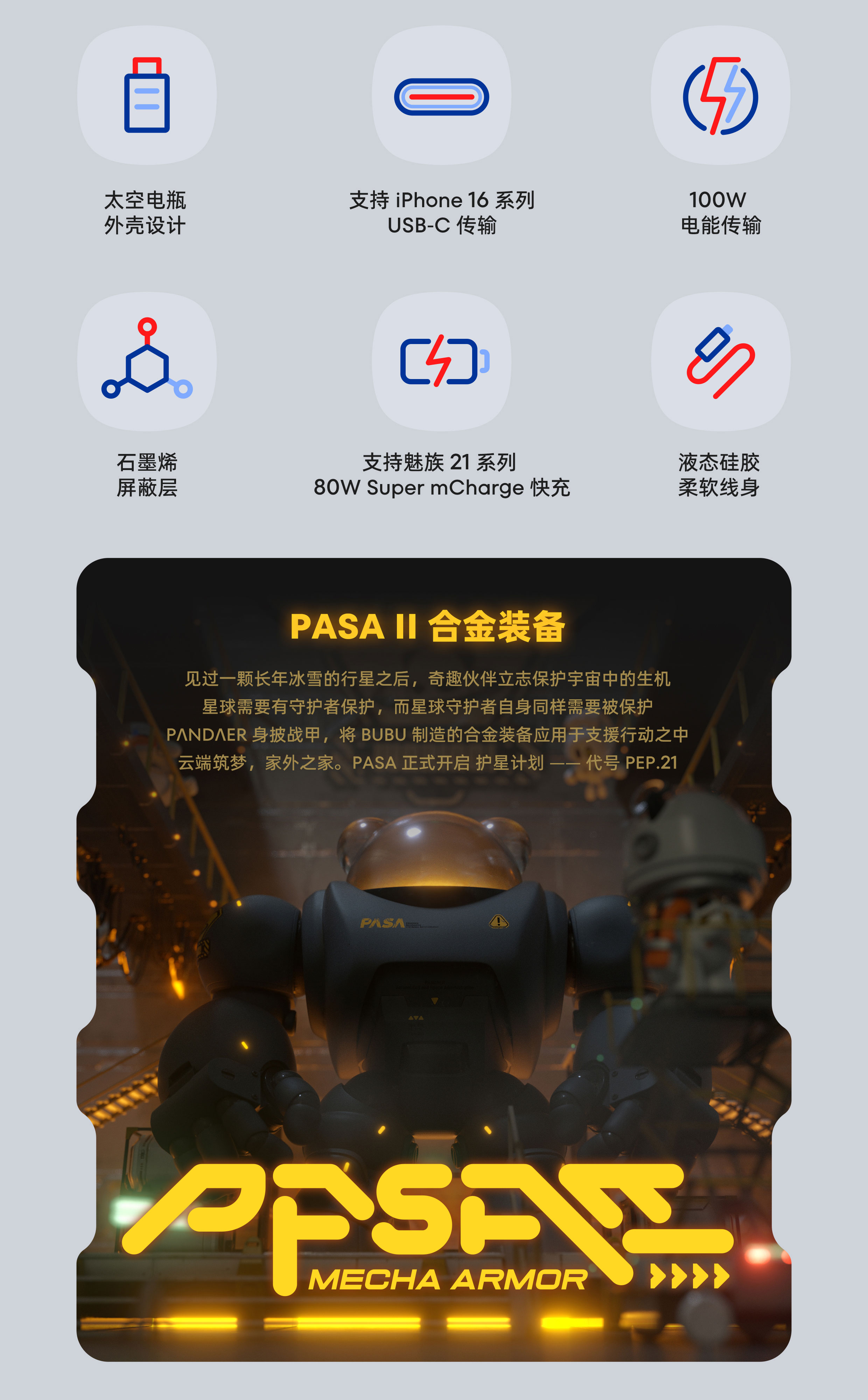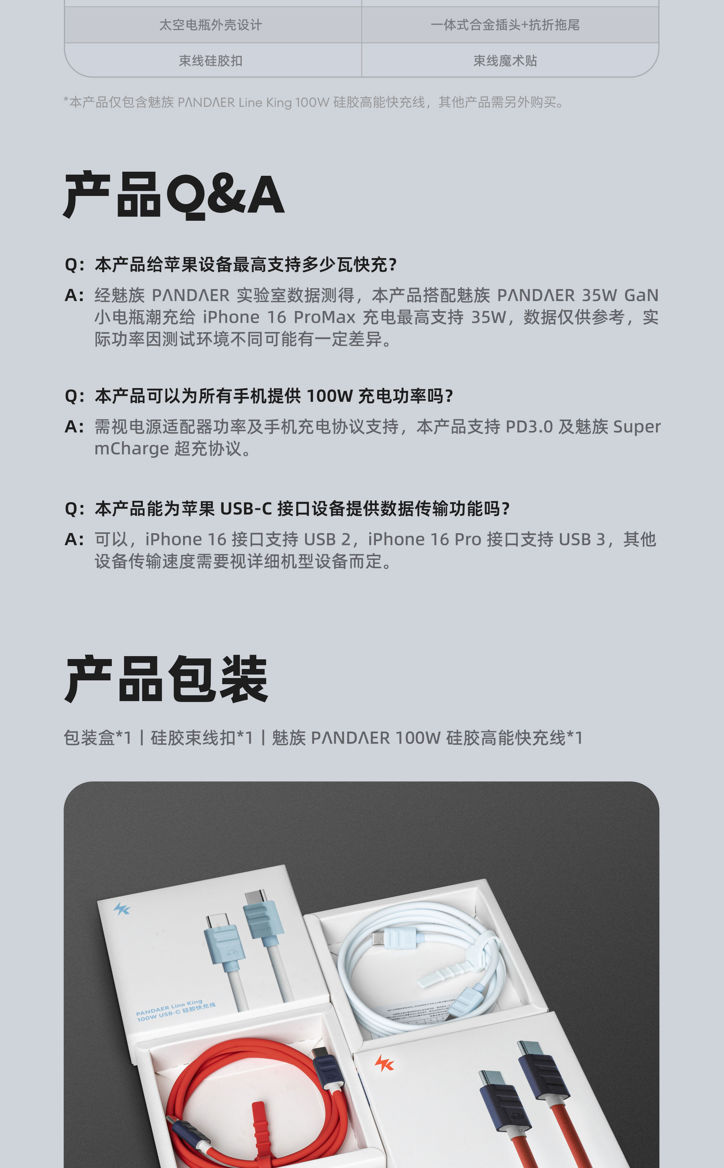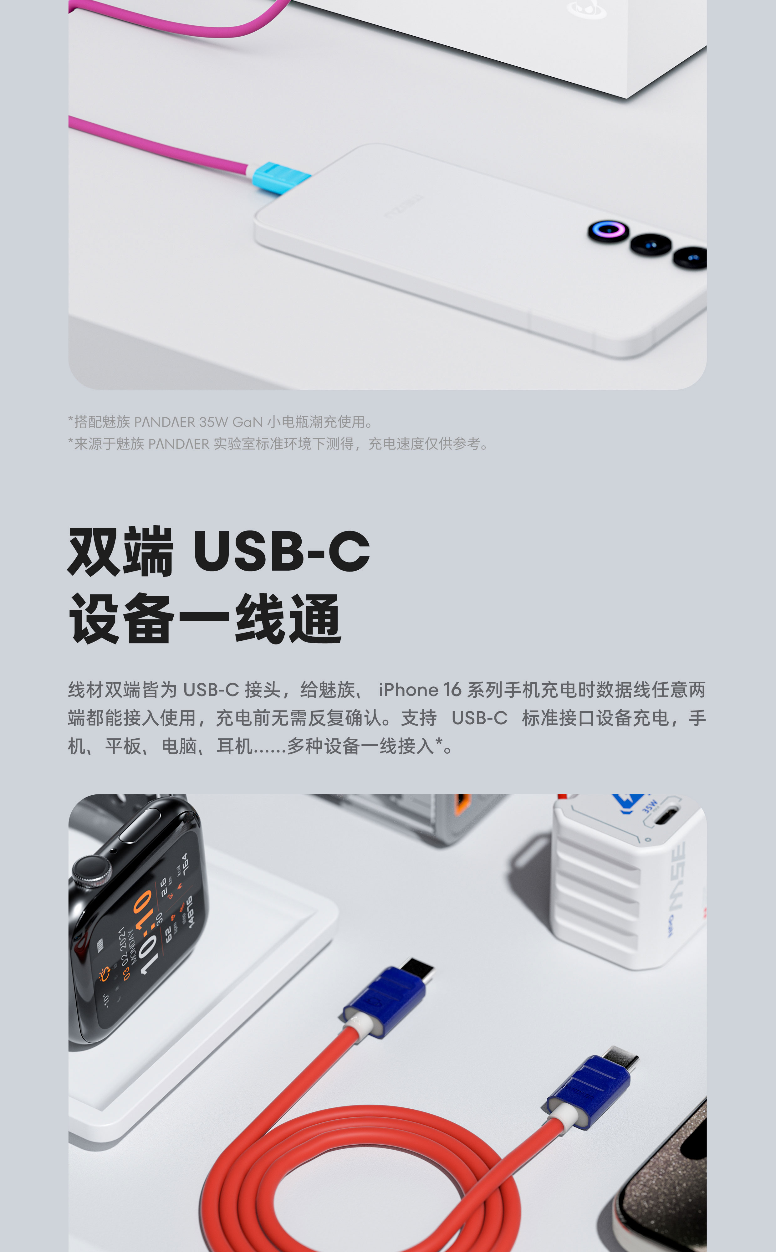 支持魅族 21 系列快充 | 支持 iPhone 16 系列 USB-C 传输 | 100W 电能传输 | 石墨烯屏蔽层 | 液态硅胶柔软线身 | 太空电瓶外壳设计