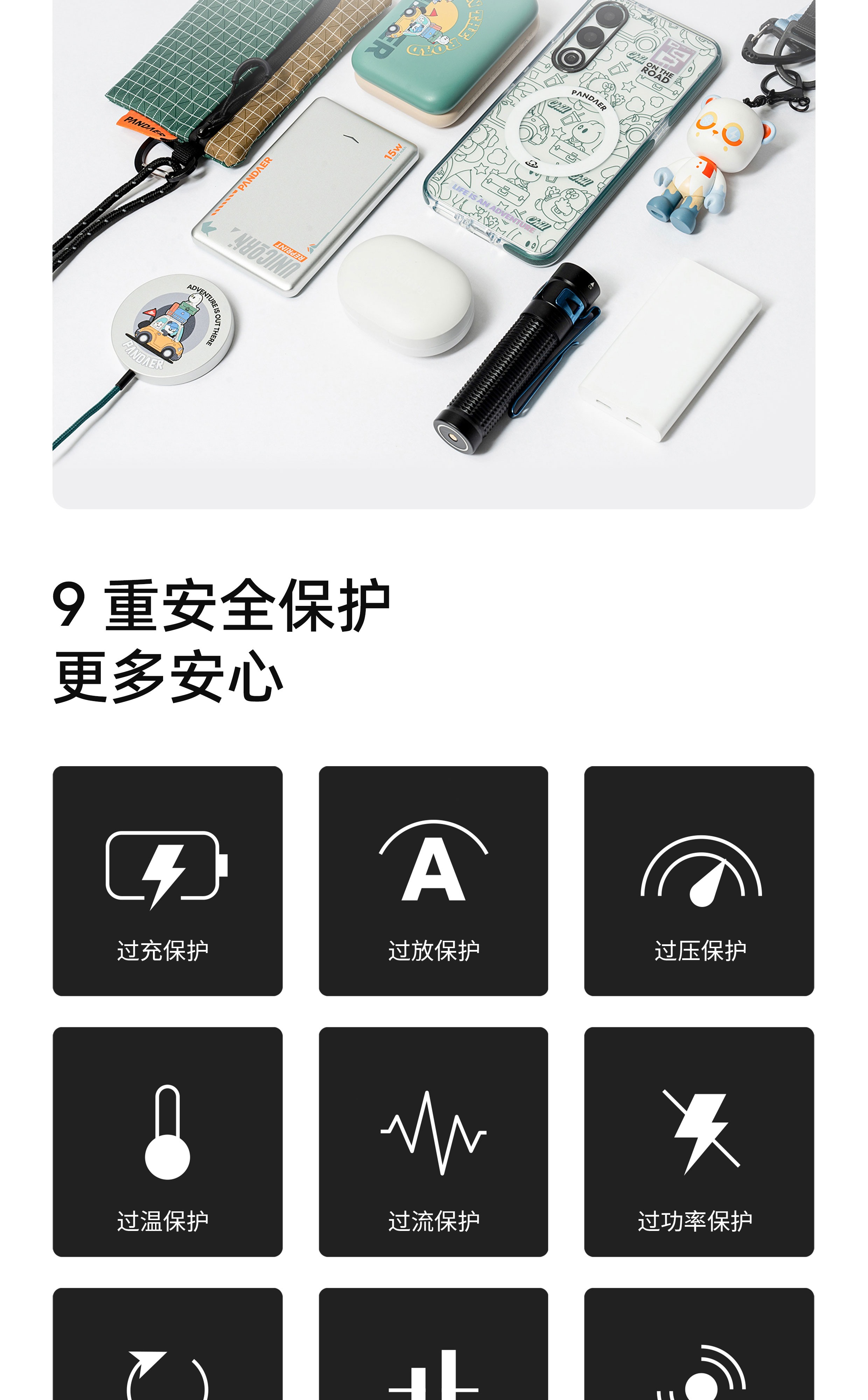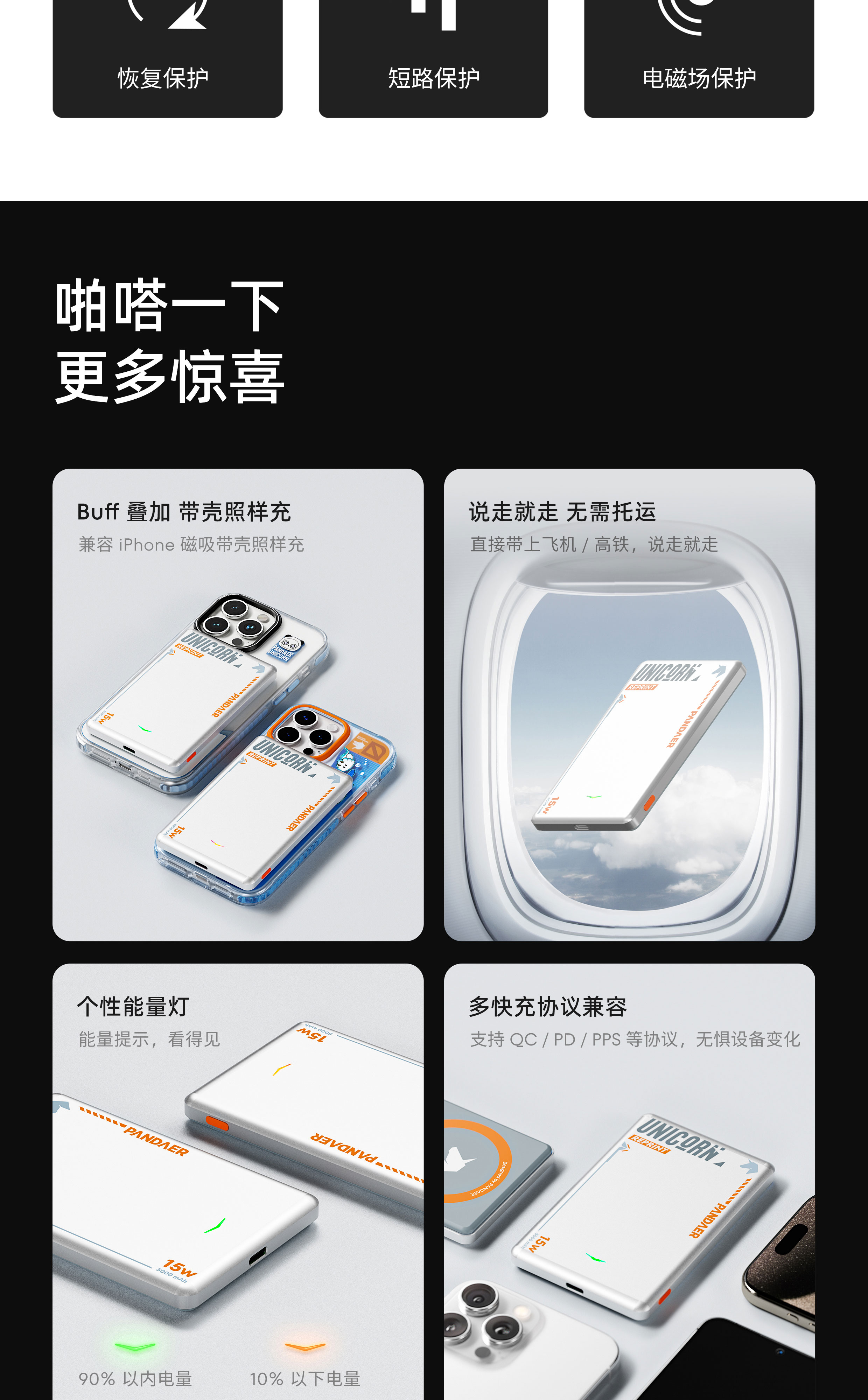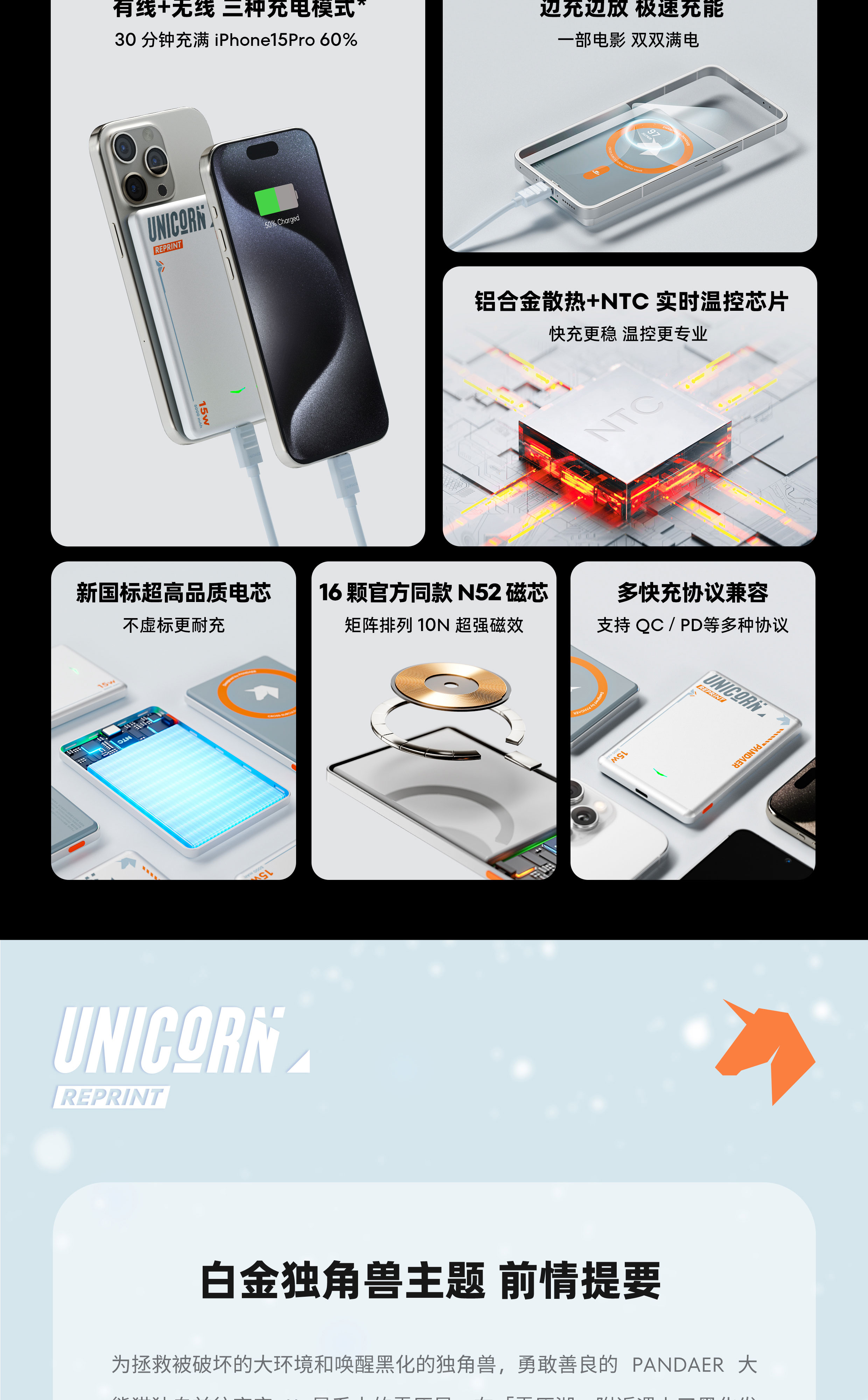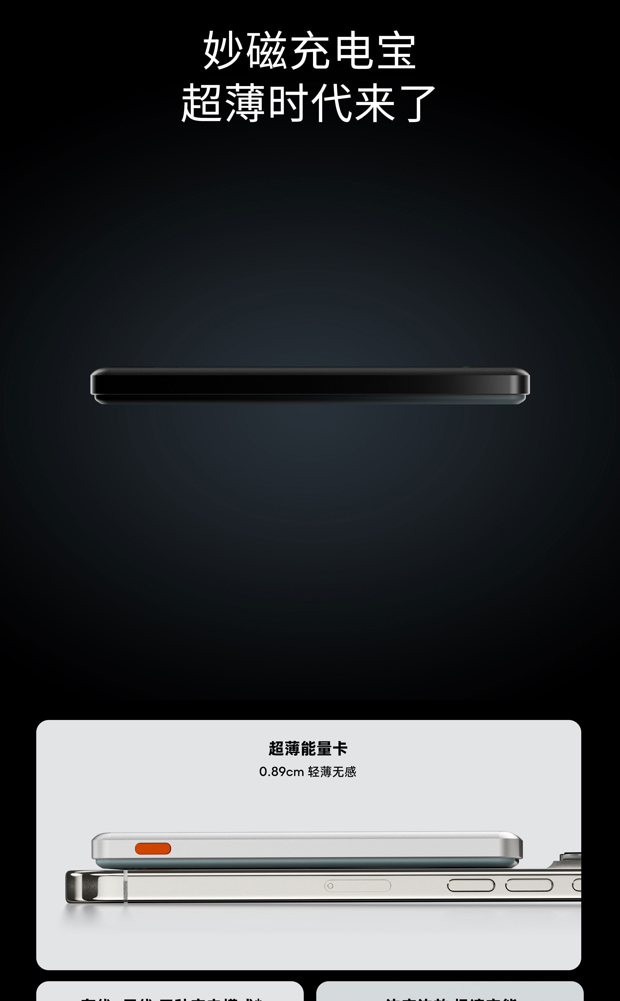 0.89cm 轻薄无感 | 有线+无线 三种充电模式 | 10N 强磁吸附 | 高品质电芯 | 多快充协议兼容 | 9重安全保护 | 可上飞机
