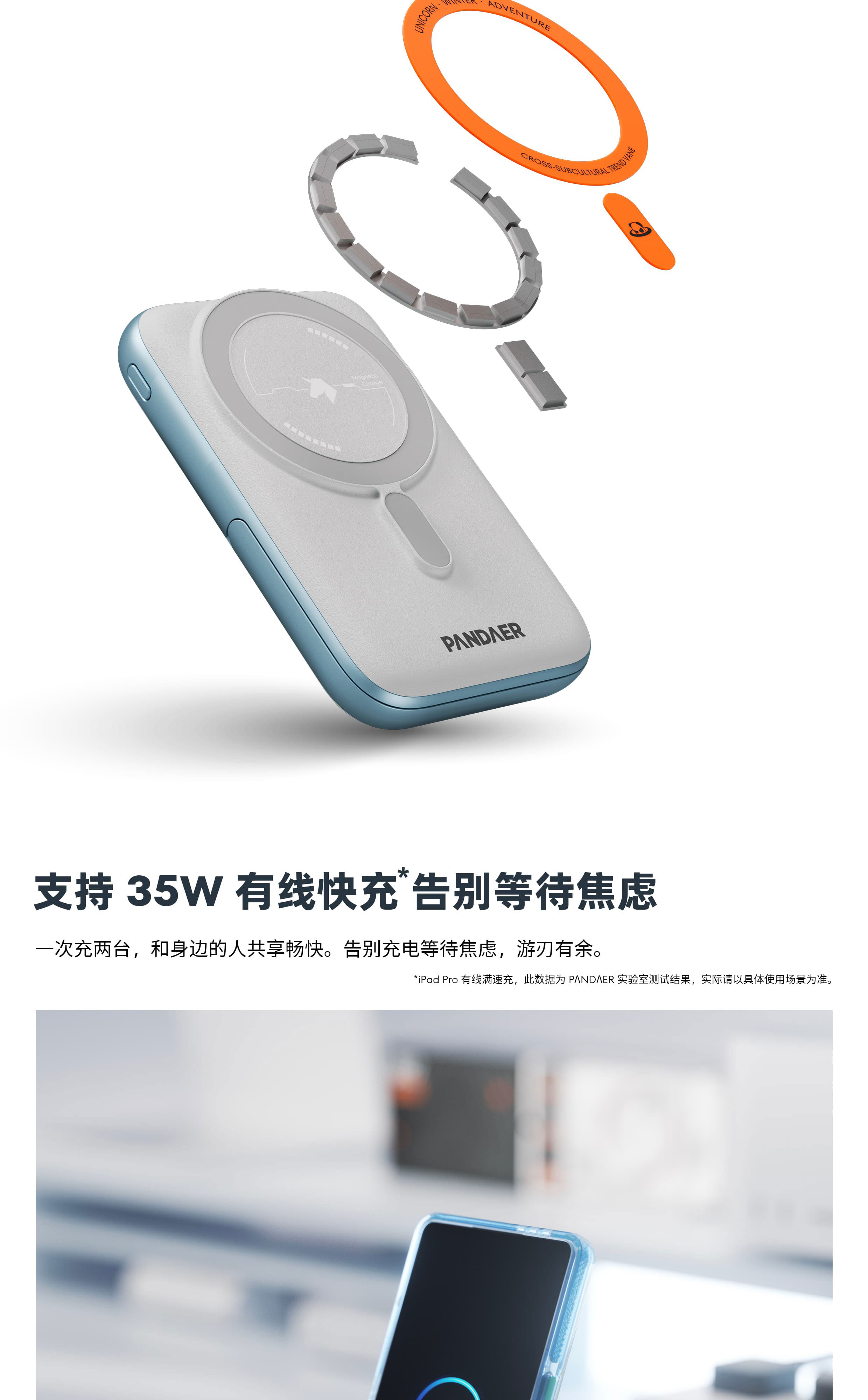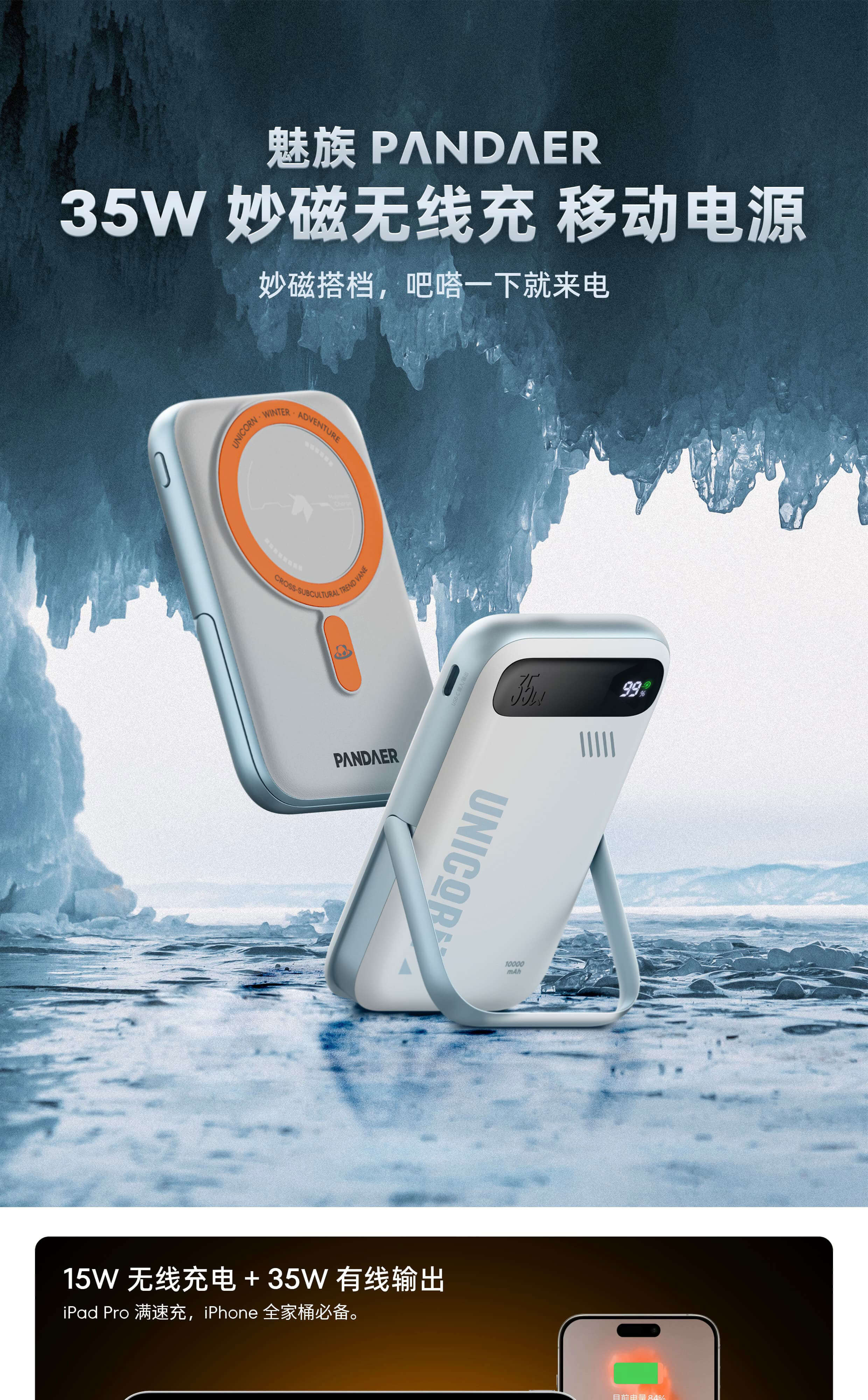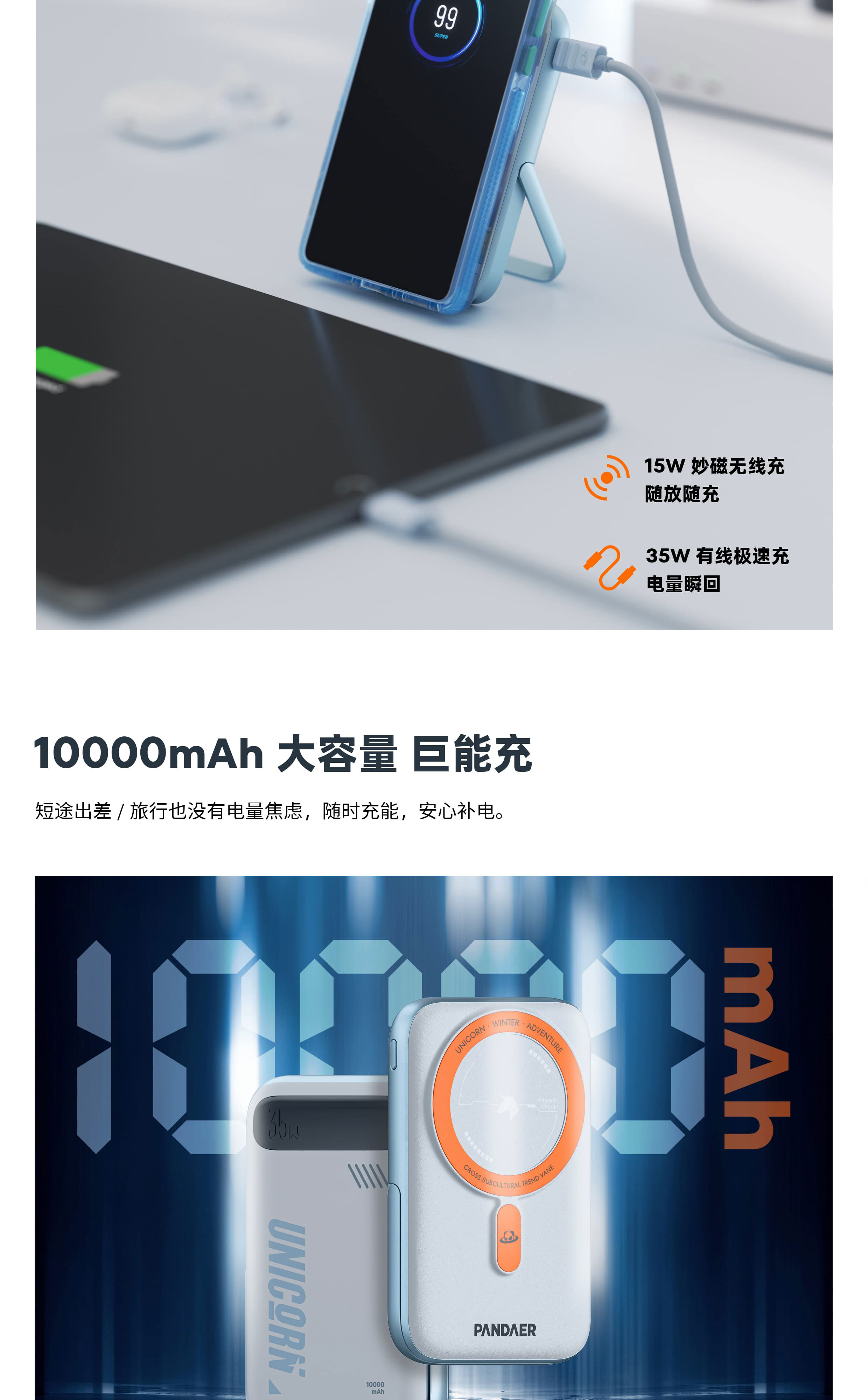 15W 无线充电 | 35W 有线快充 | 10000mAh 容量 | 数字电量显示 | 锌合金隐藏支架