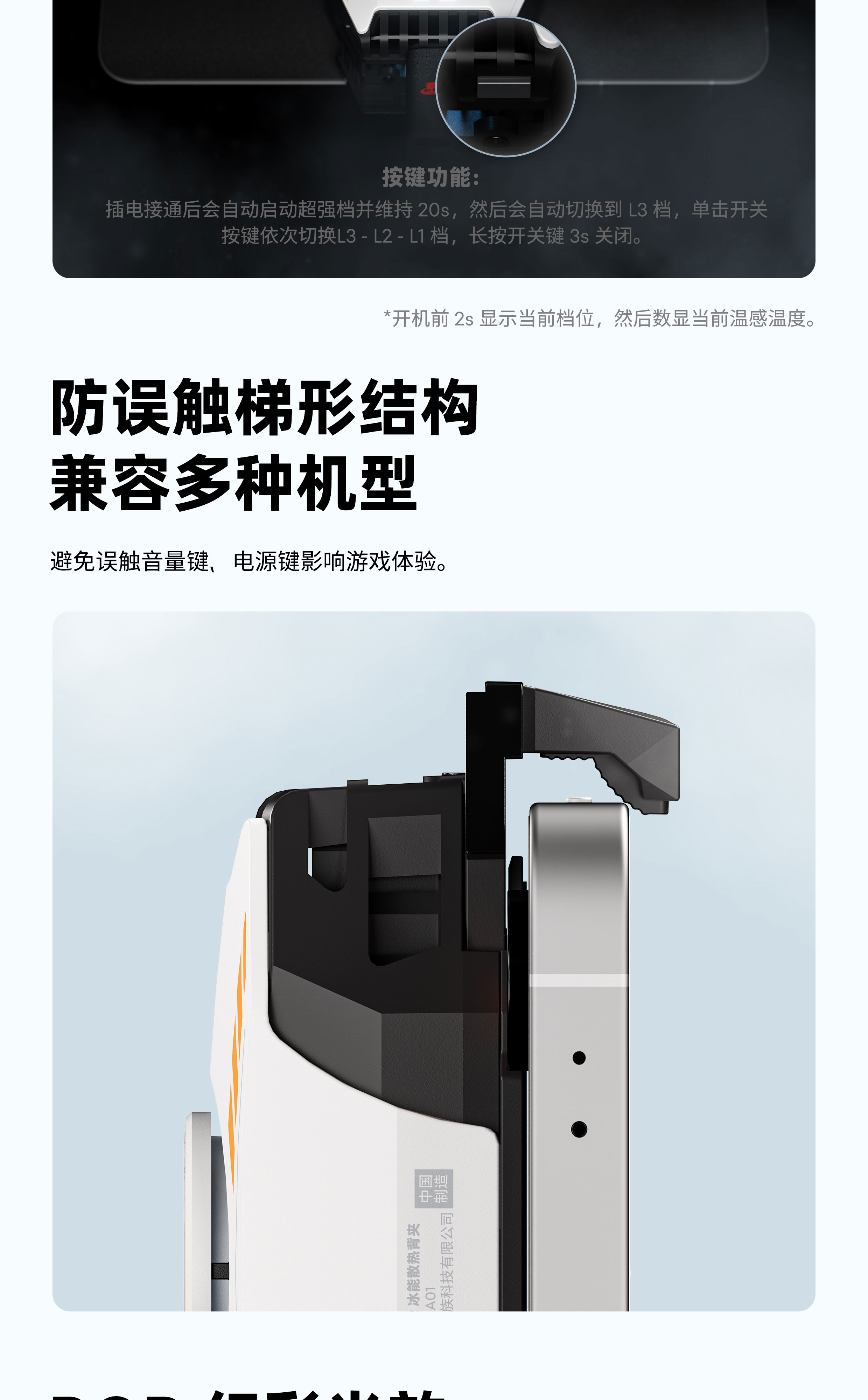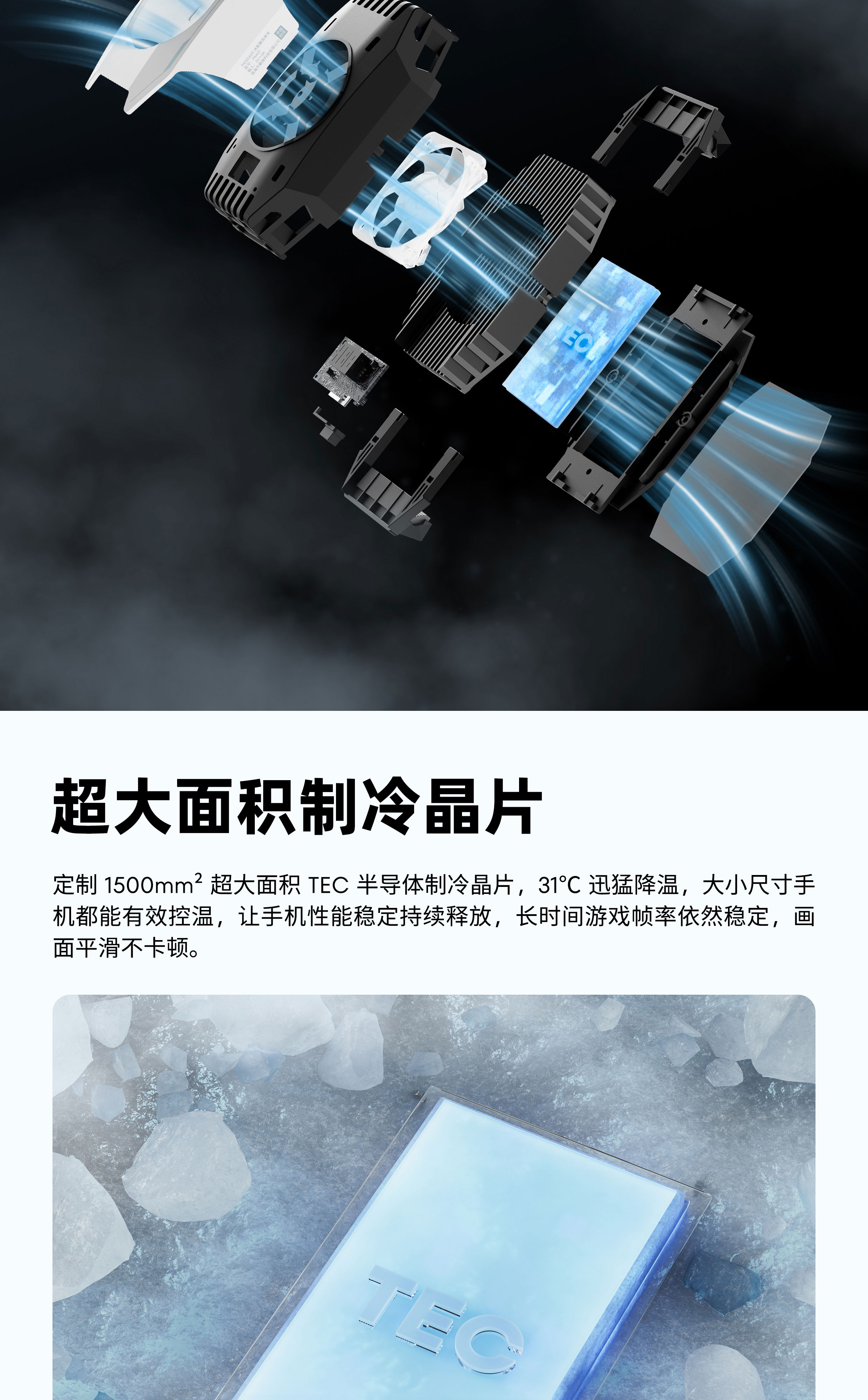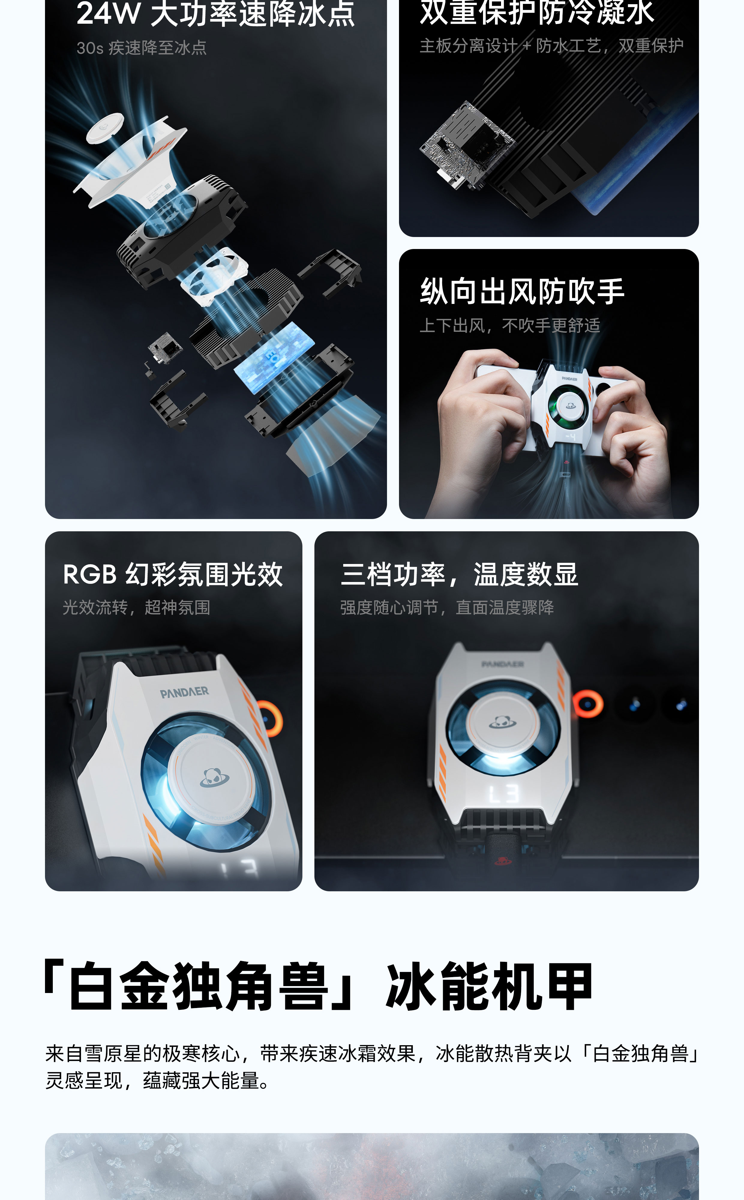 超大 TEC 制冷晶片 | 24W 大功率速降冰点 | 双重保护防冷凝水 | 纵向出风防吹手 | RGB 幻彩氛围光效 | 三档功率,温度数显