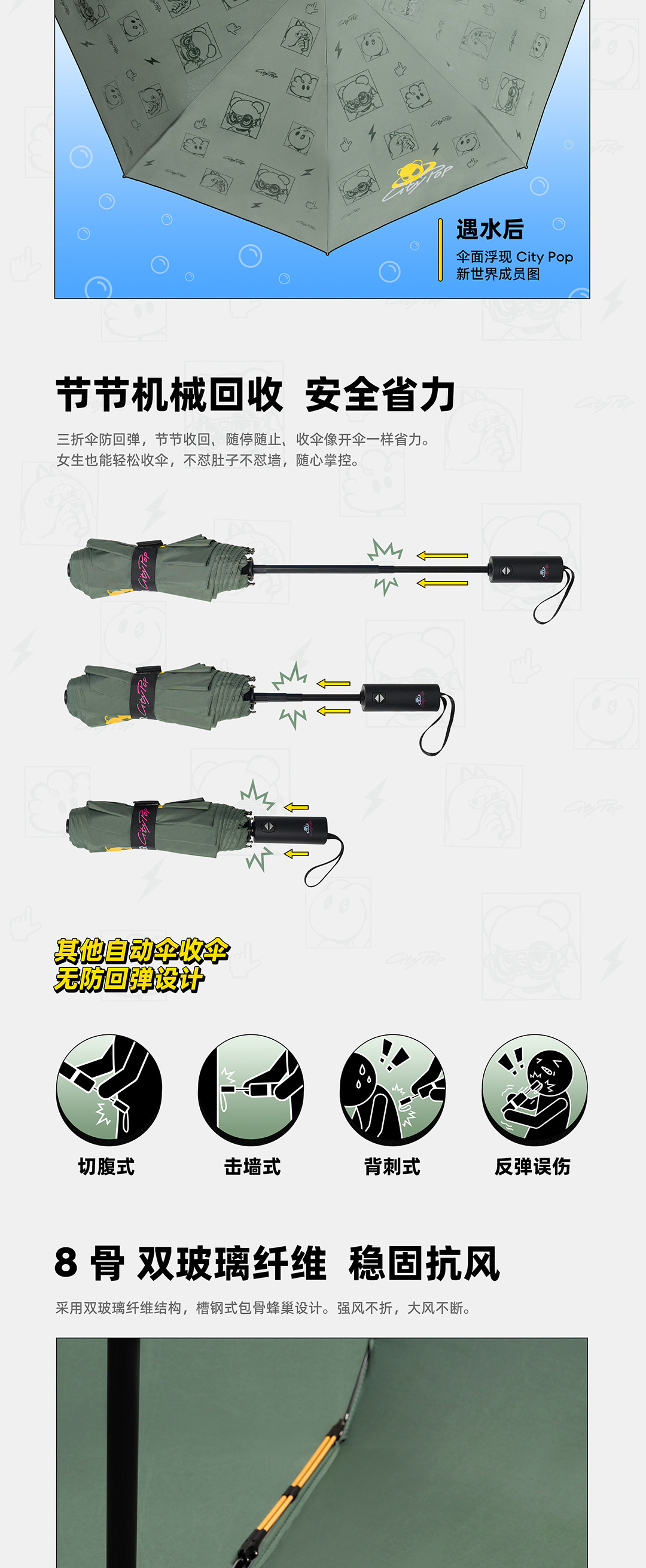 遇水浮花 撑起新世界| 节节机械回收 安全省力|8 骨双玻璃纤维抗风 强风不折|280T 高密度伞布 拒水速干|105 直径大伞面 有效增加挡雨面积