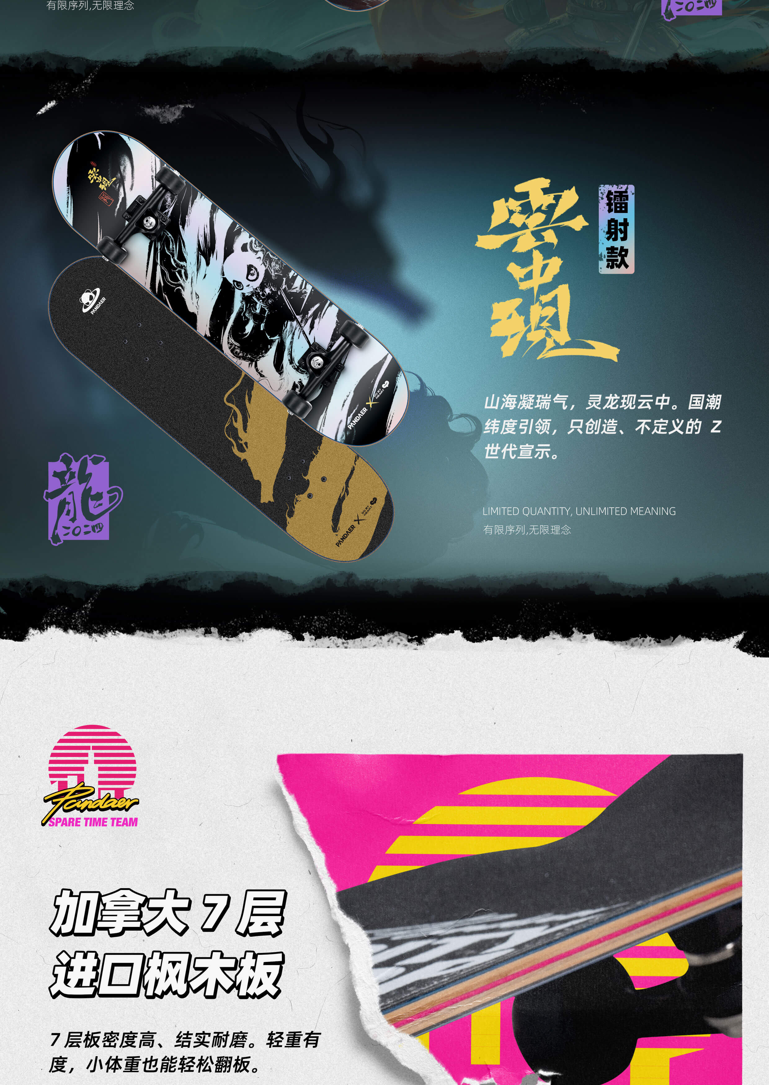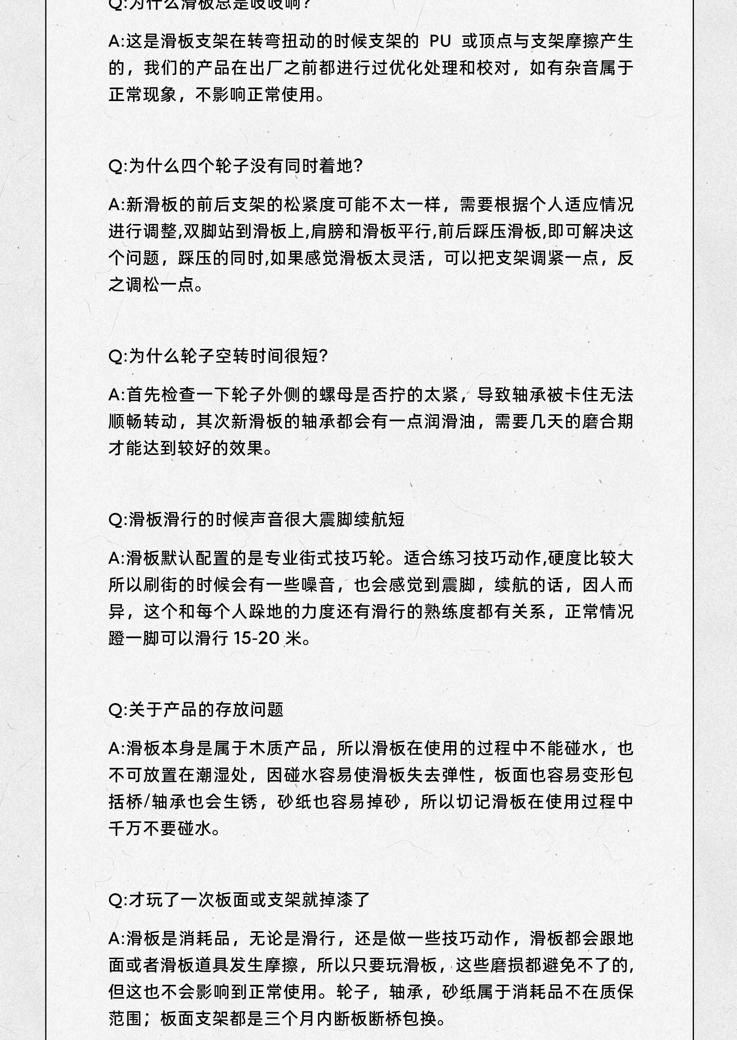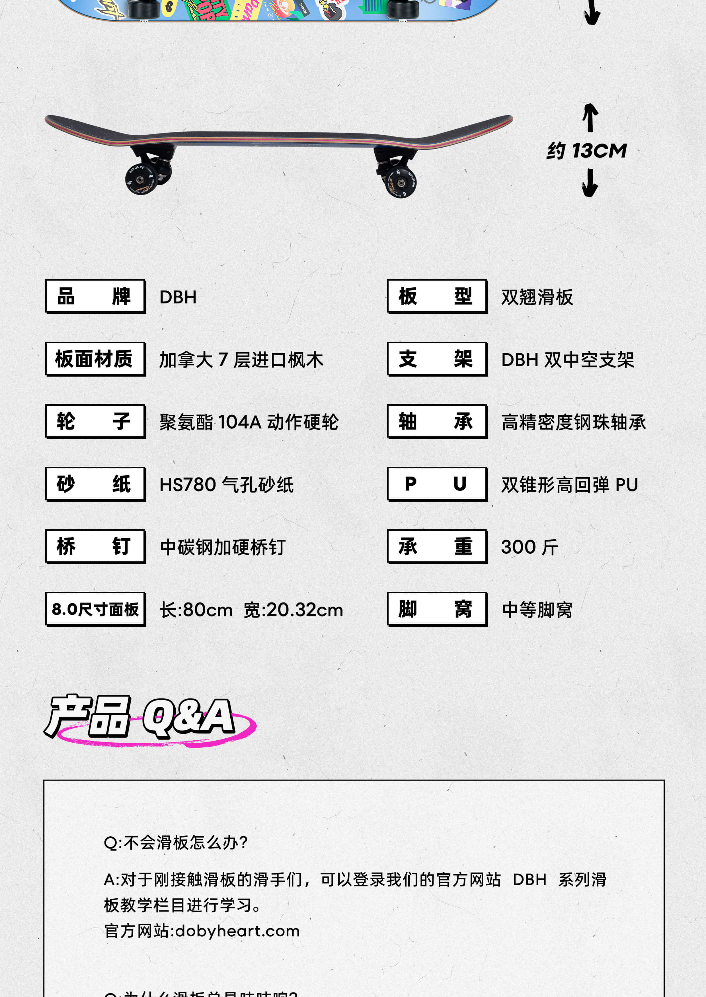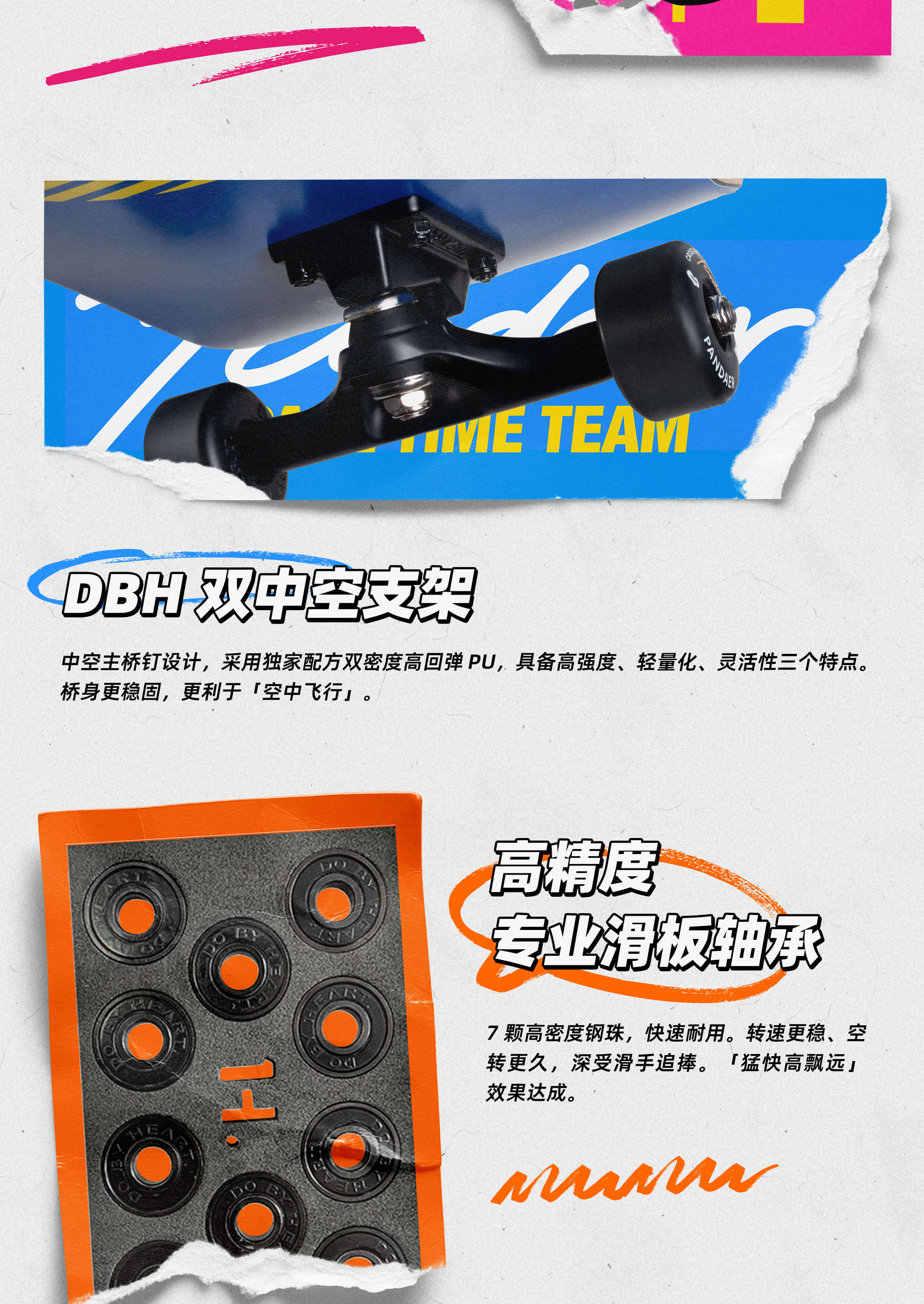 加拿大 7 层进口枫木板 | DBH 双中空支架 | 独家配方 街式硬轮 | 高精度专业滑板轴承 | 全静电气孔砂纸