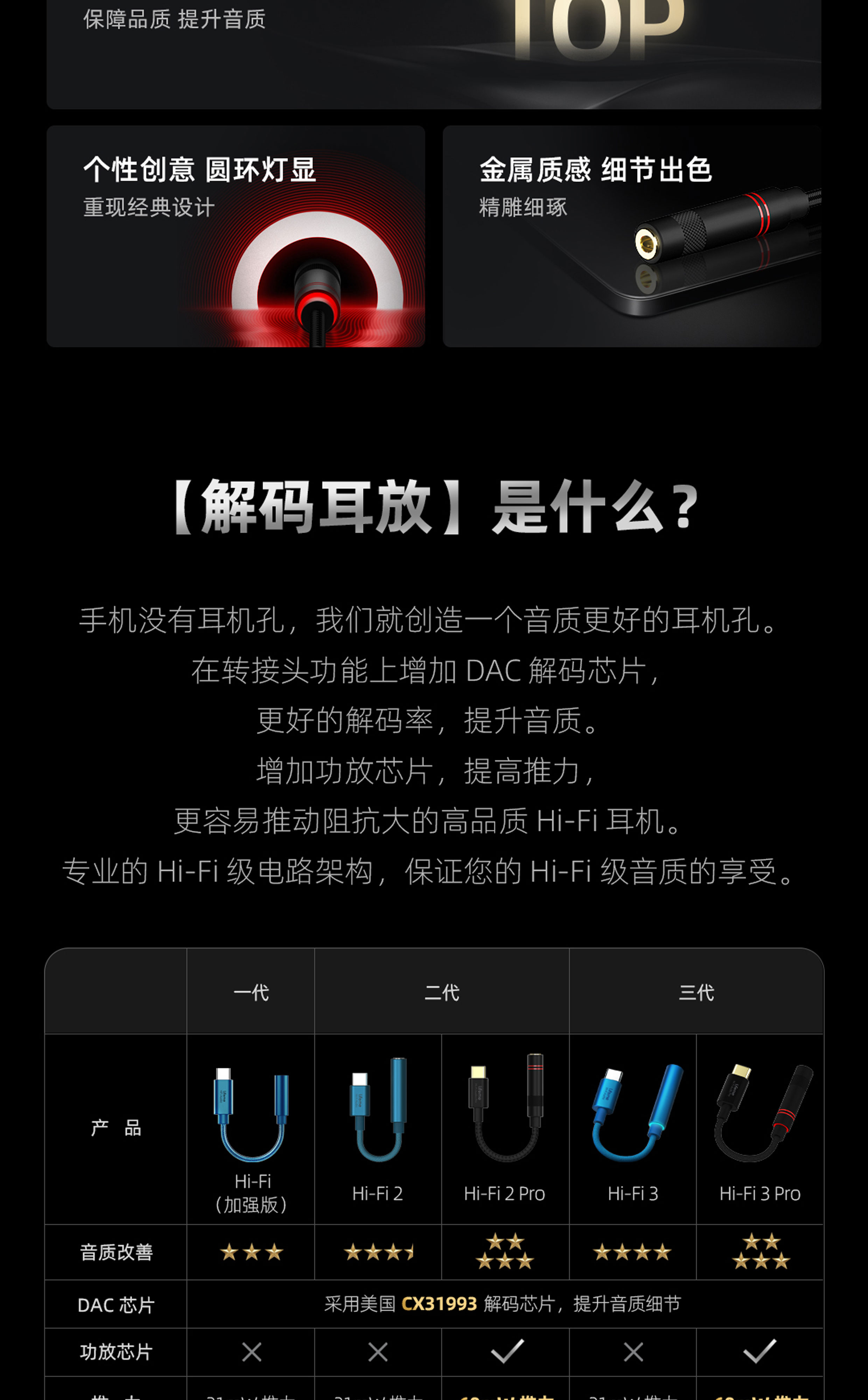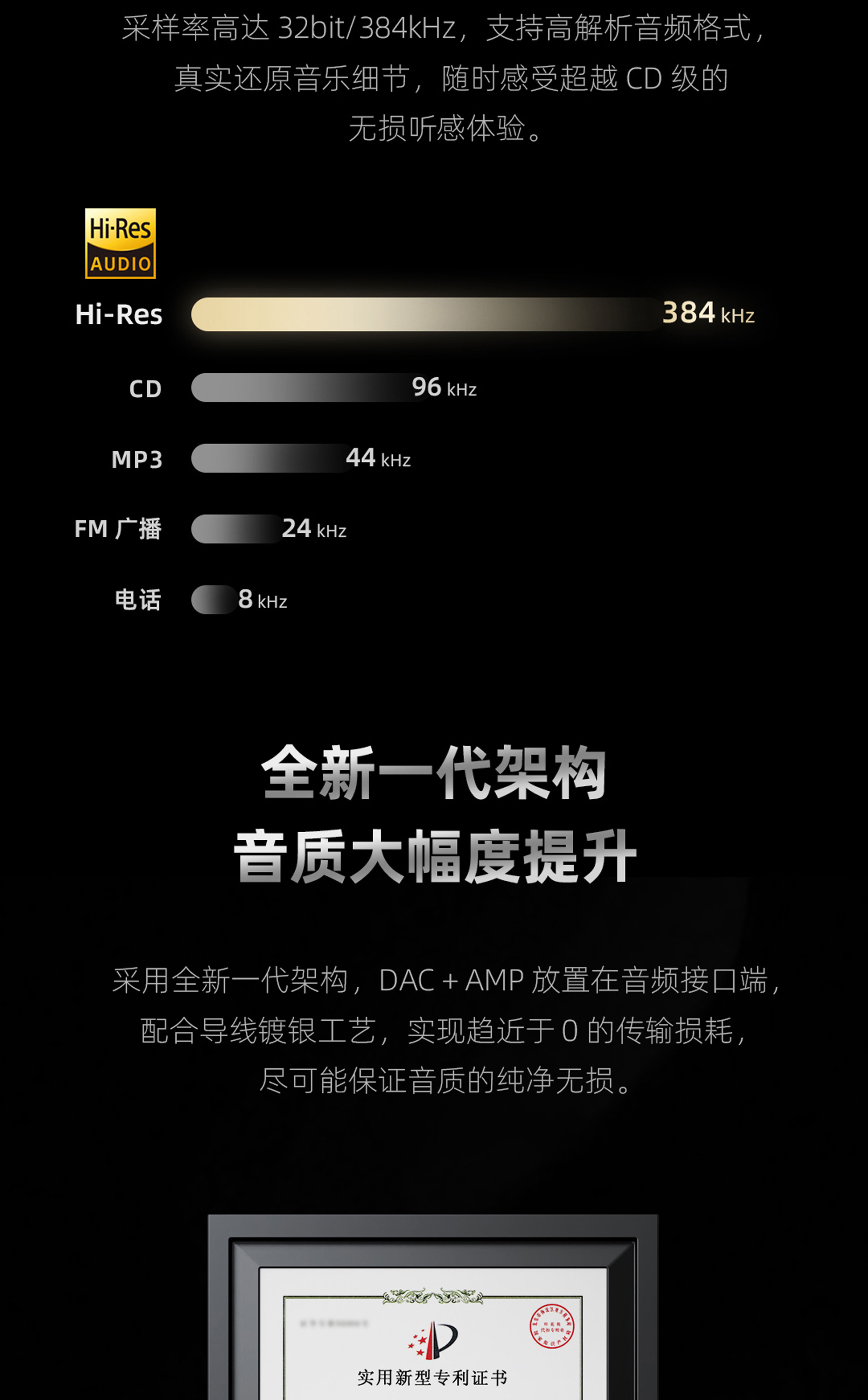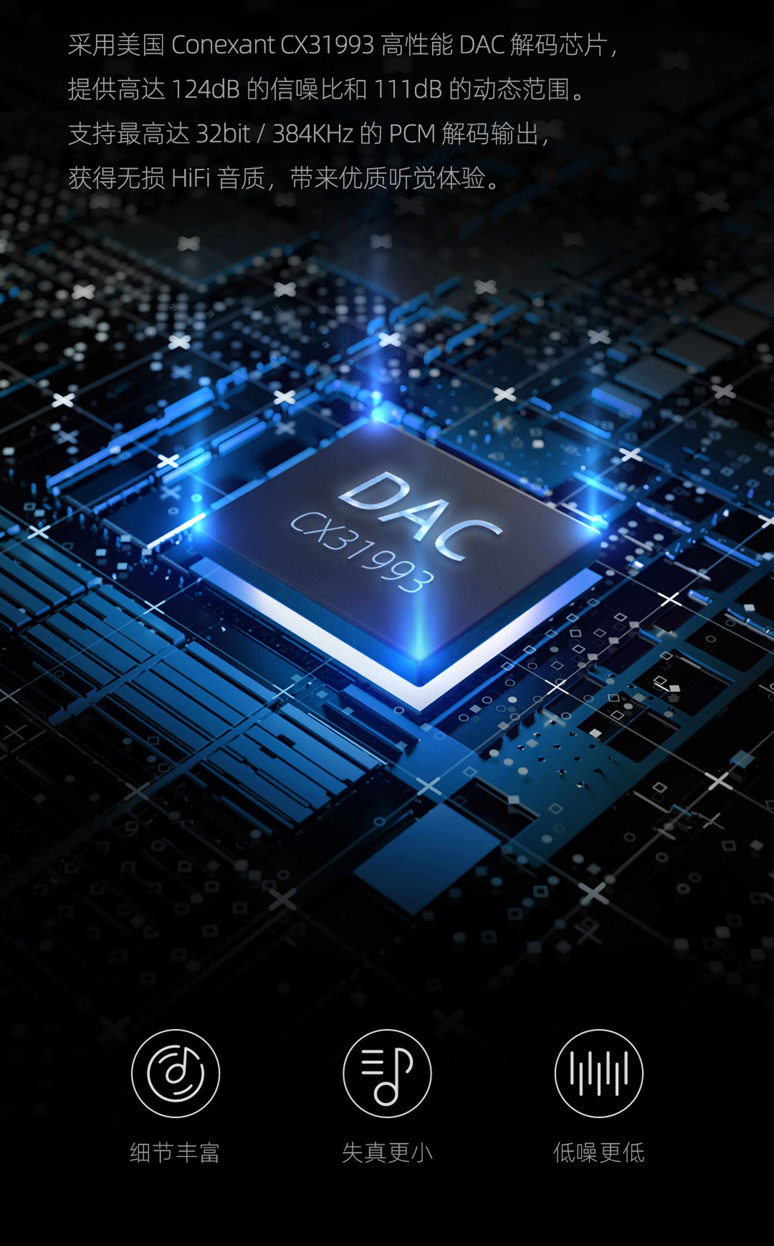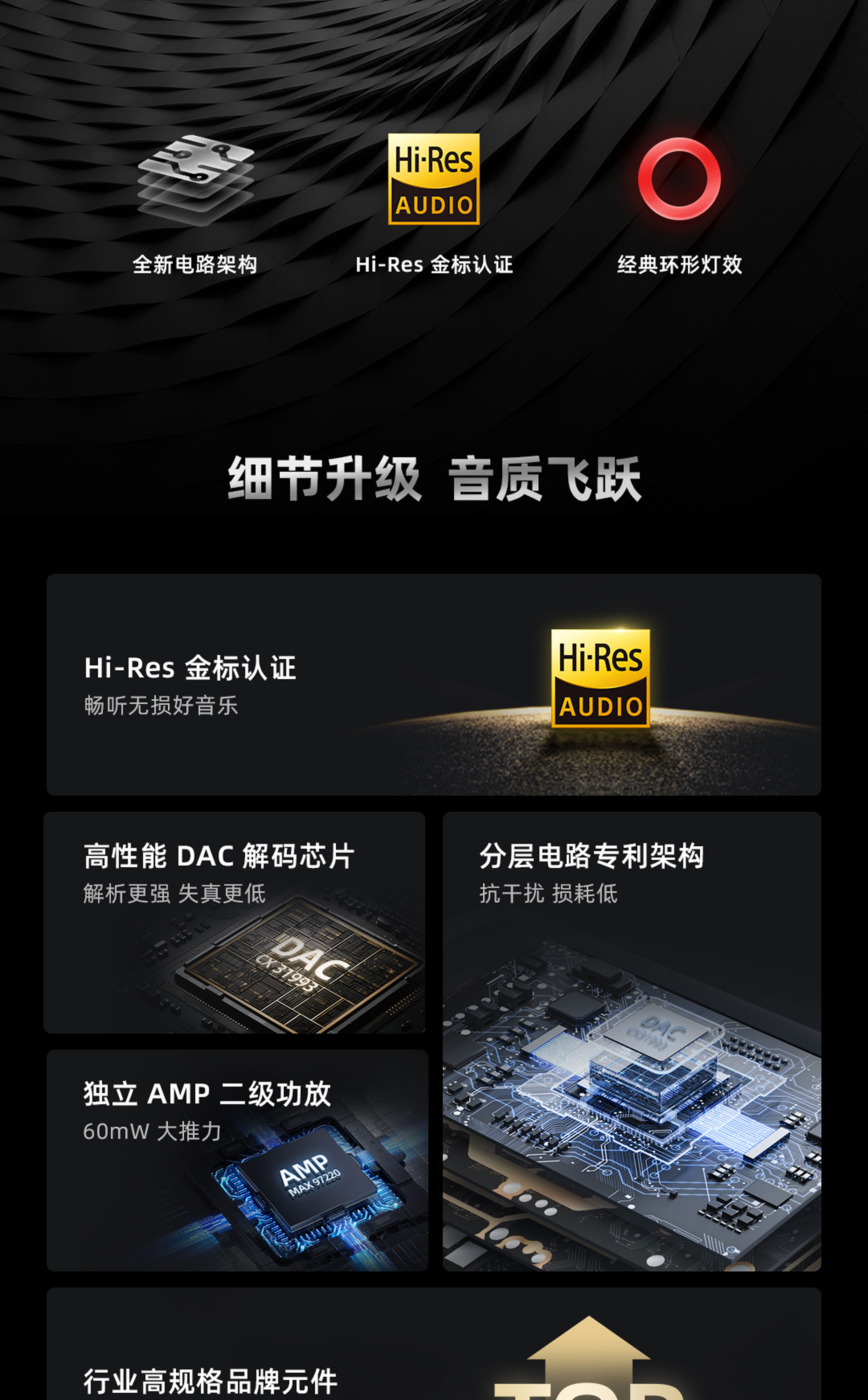 专利新架构 | 高性能 DAC 解码芯片 | Hi-Res 金标认证 | 经典环形灯显
