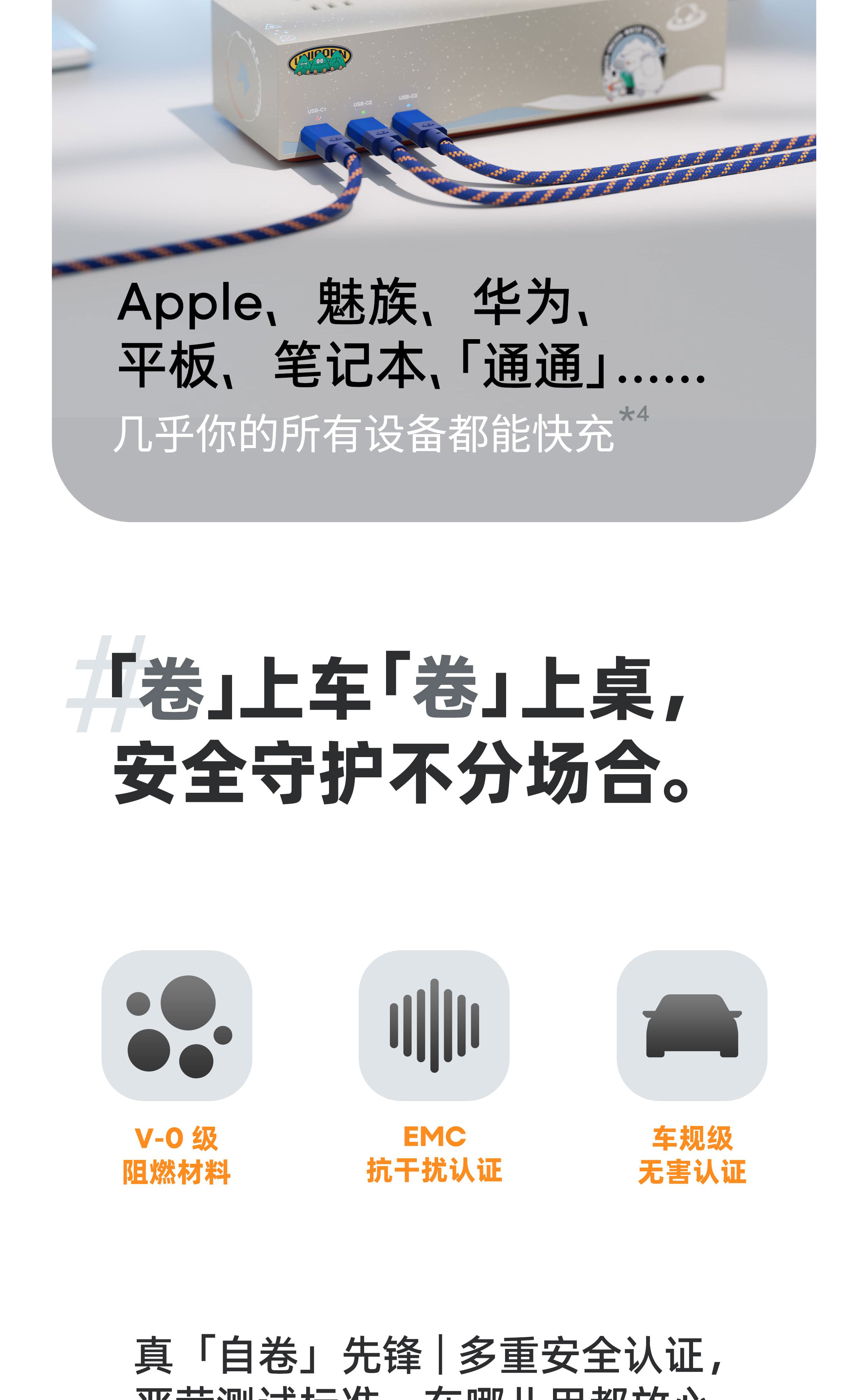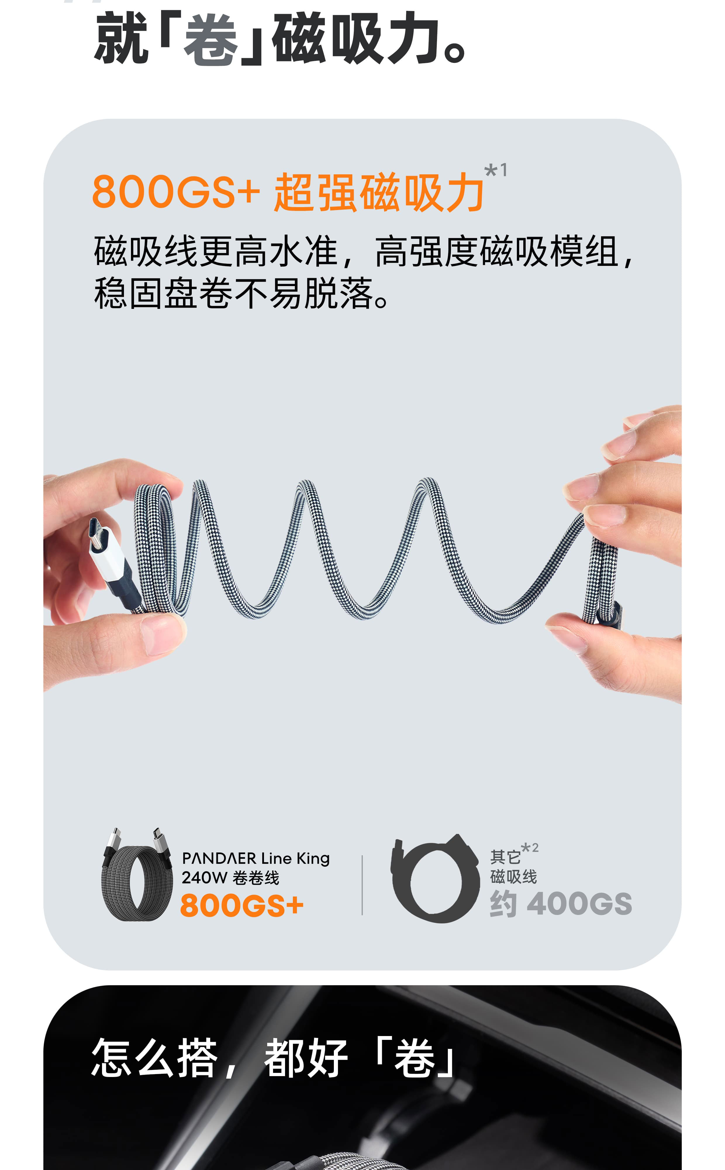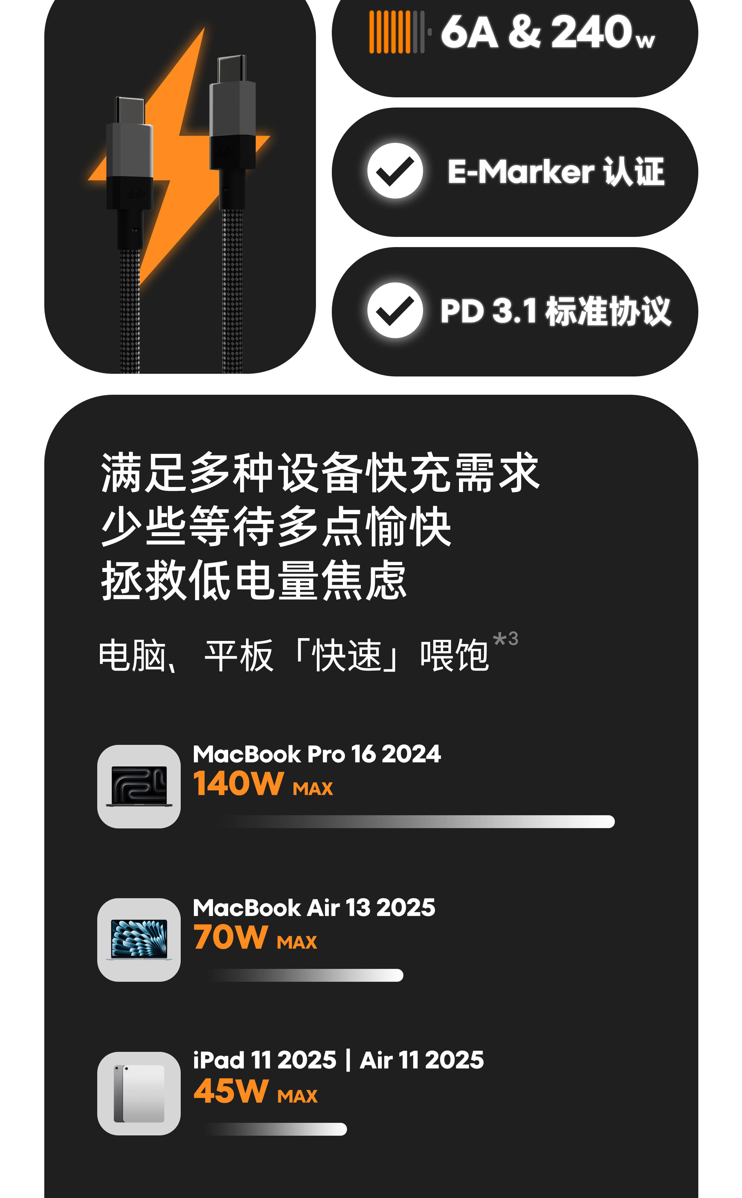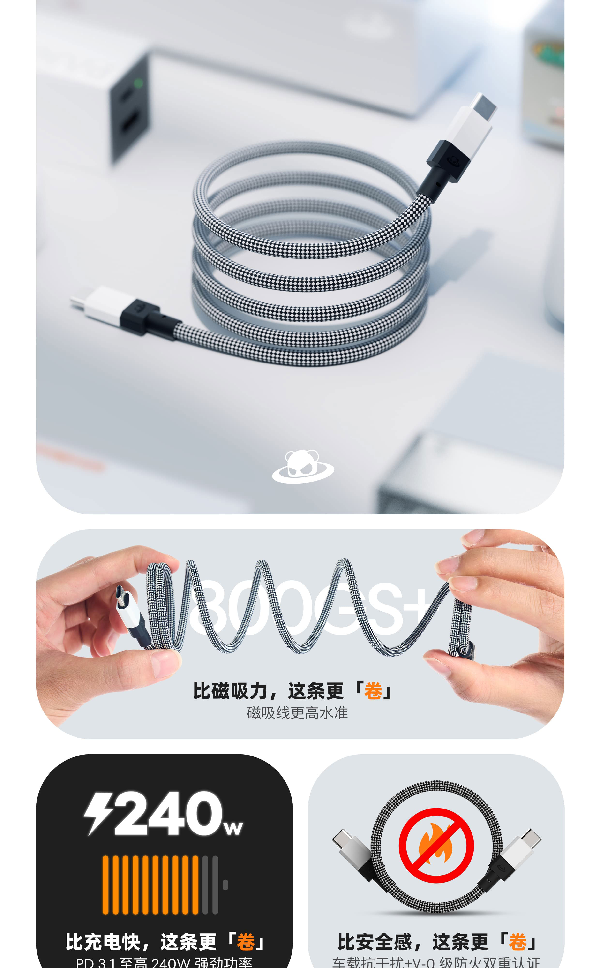 800GS+ 超强磁吸力 | 6A & 240W & PD 3.1 | V-0 阻燃 & EMC 认证 | 高密度编织 & 持久耐用