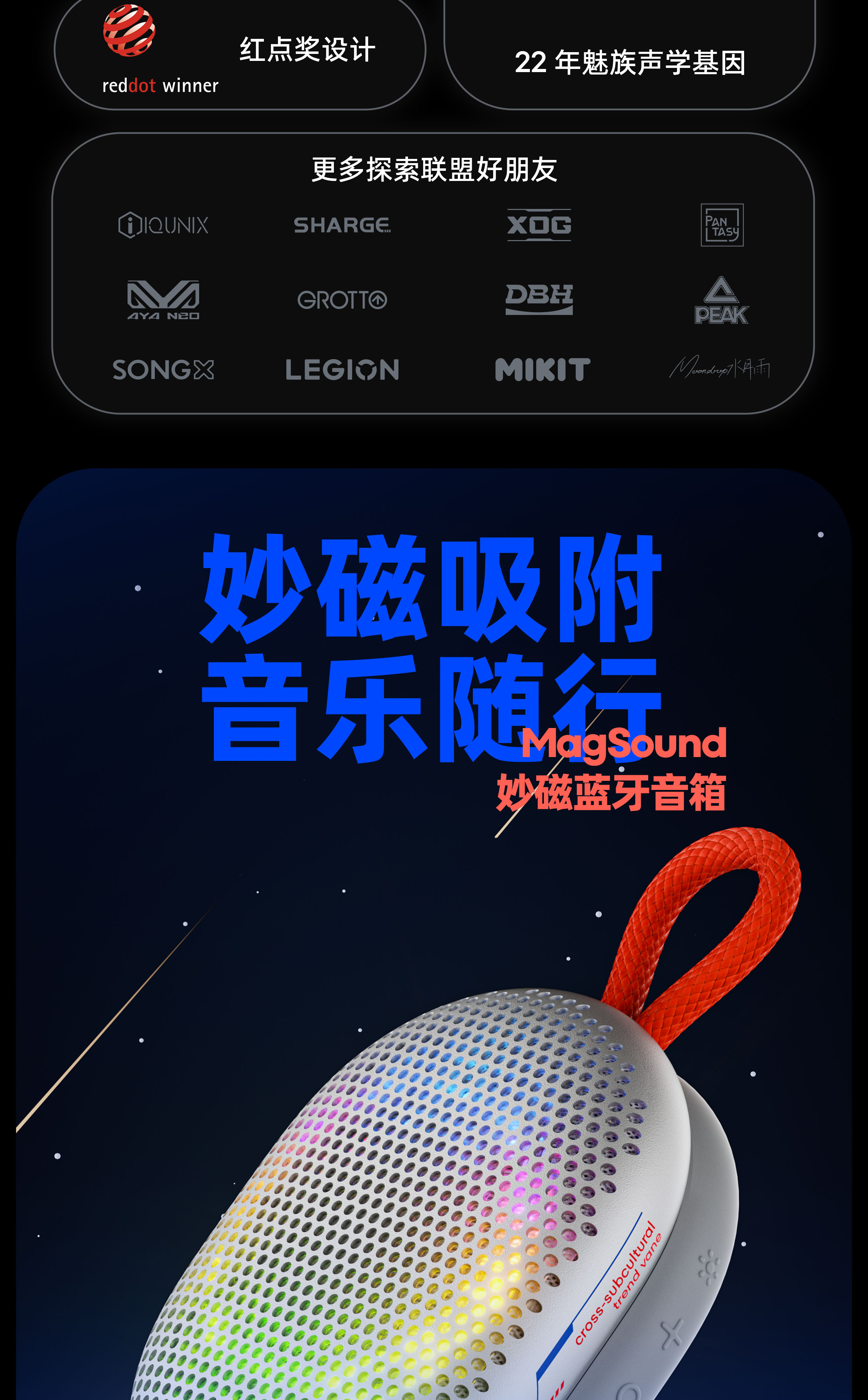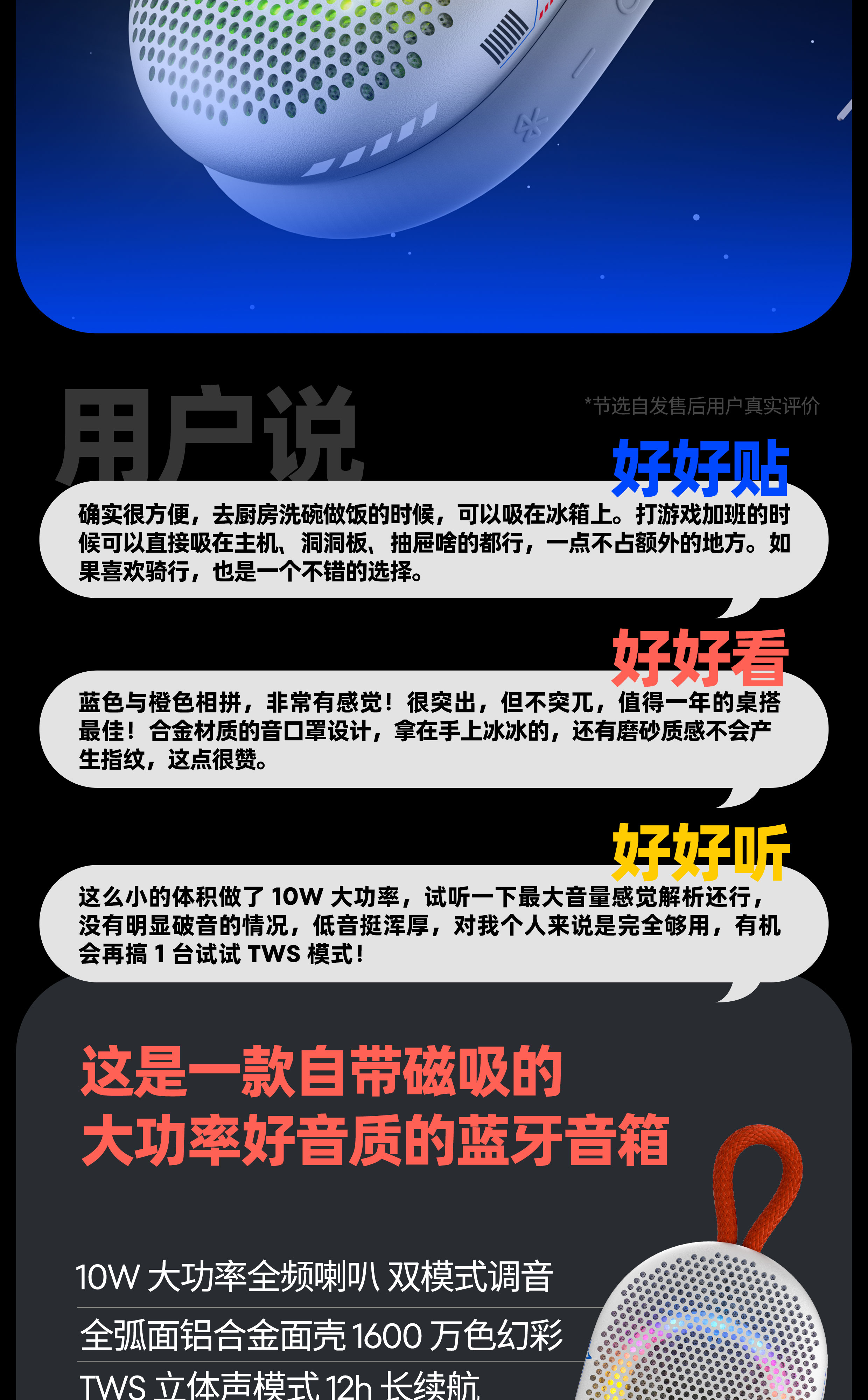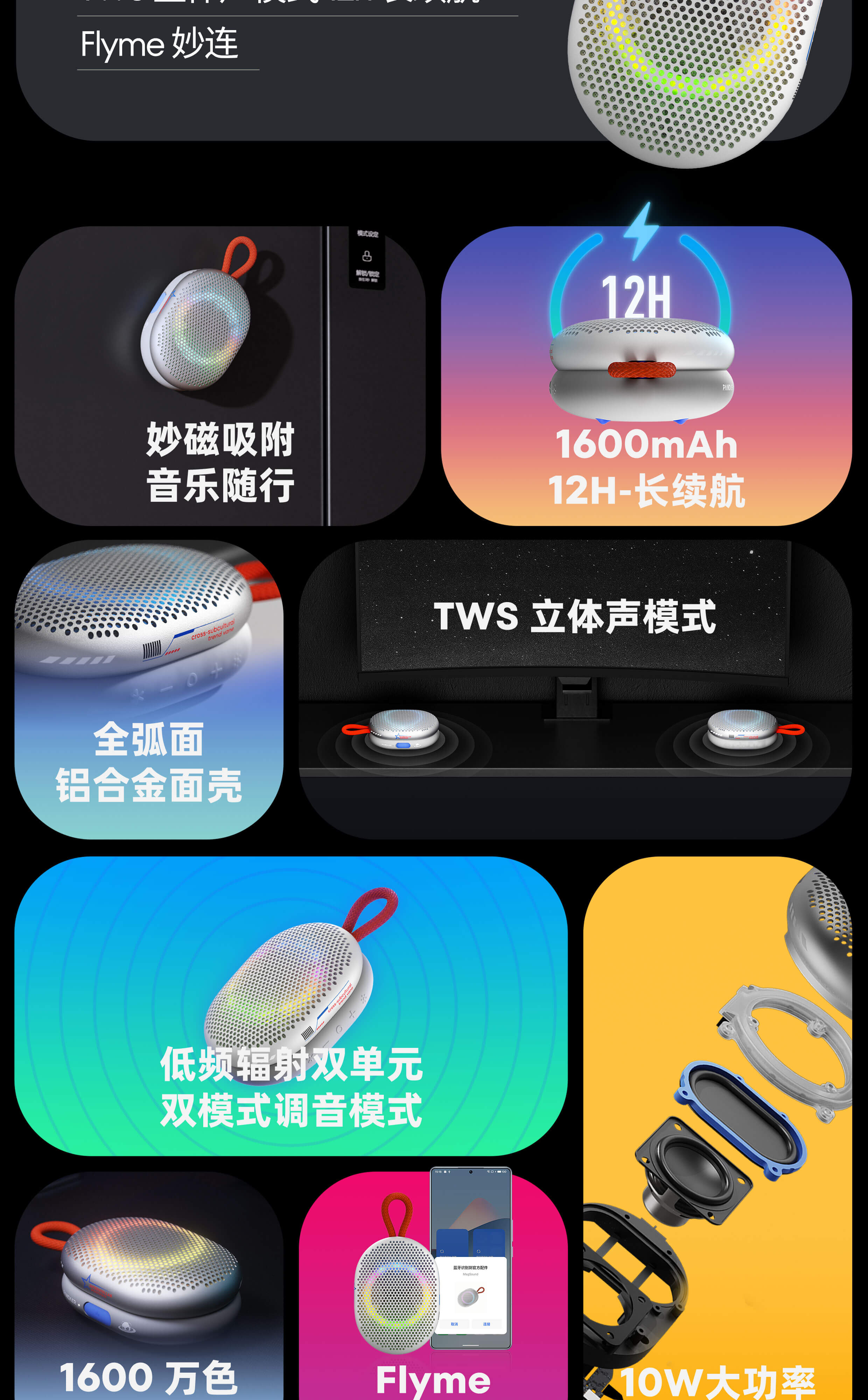 妙磁吸附 音乐随行 | 10W大功率 全频喇叭 | 低频辐射双单元 双模式调音模式 | 全弧面铝合金面壳 | TWS立体声模式 | 12H长续航 | 幻彩灯效