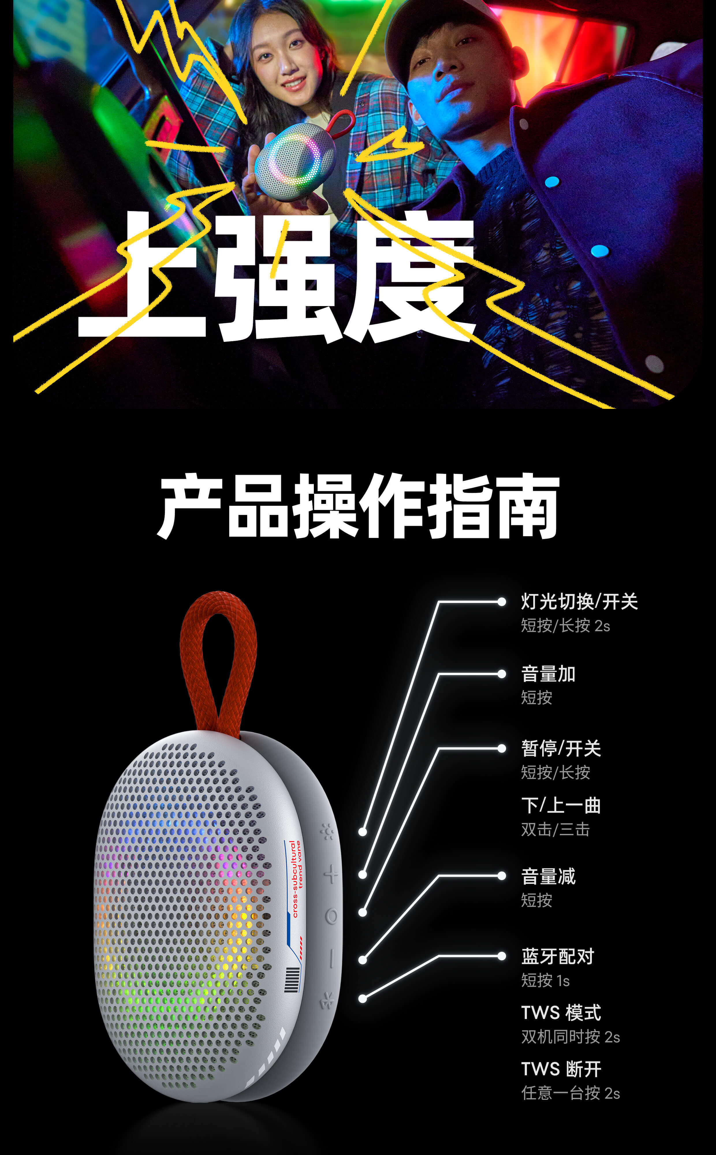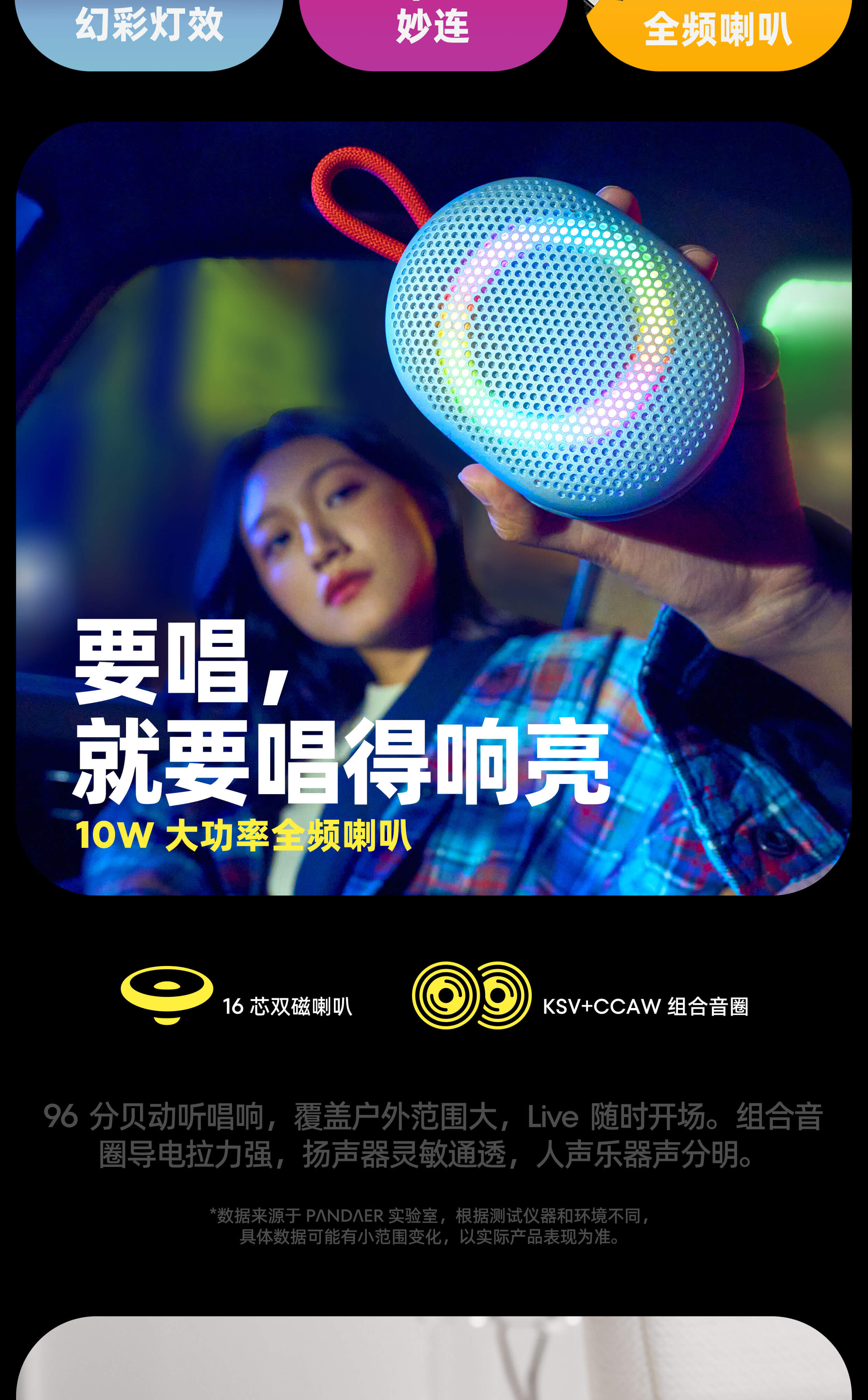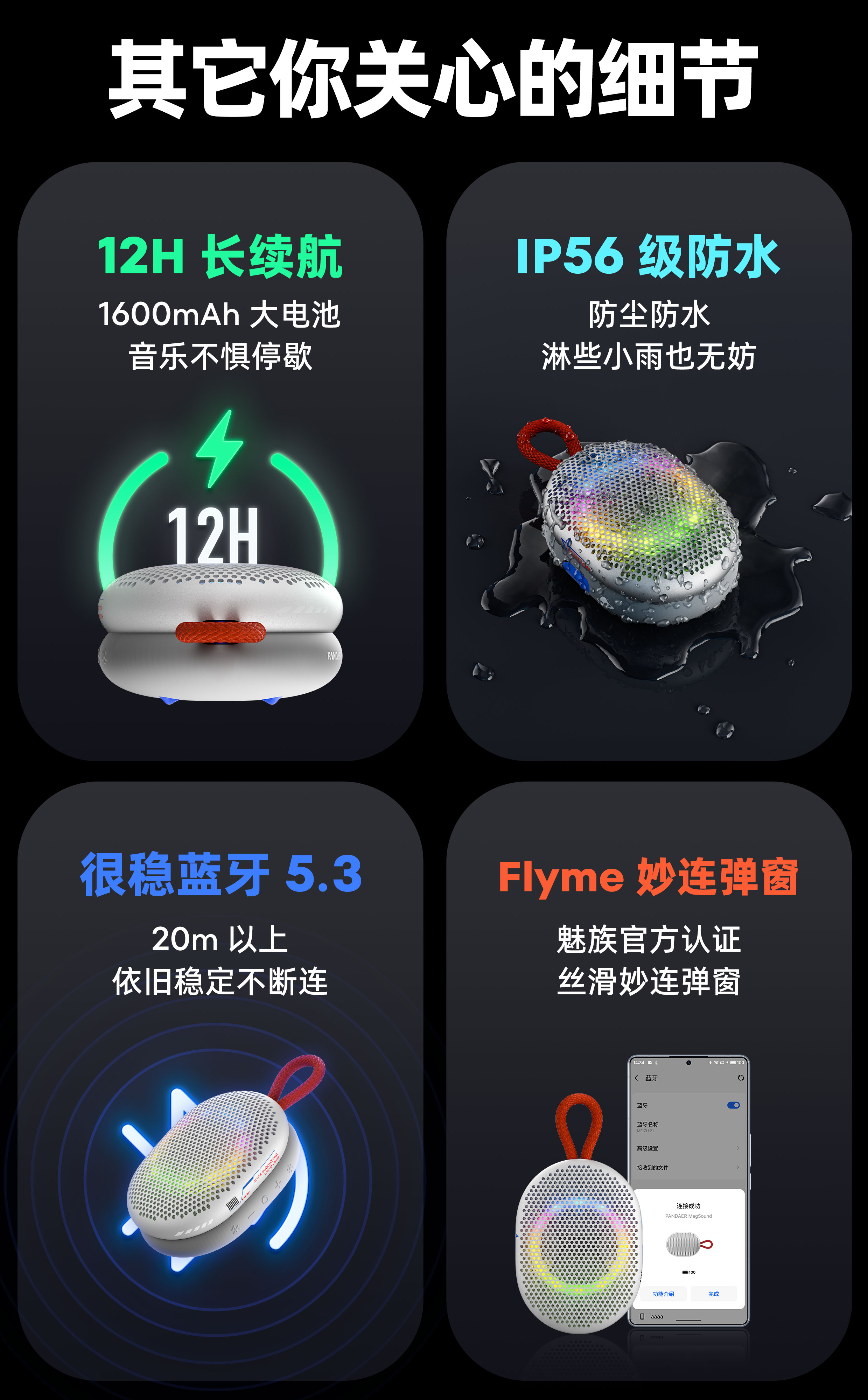 妙磁吸附 音乐随行 | 10W大功率 全频喇叭 | 低频辐射双单元 双模式调音模式 | 全弧面铝合金面壳 | TWS立体声模式 | 12H长续航 | 幻彩灯效