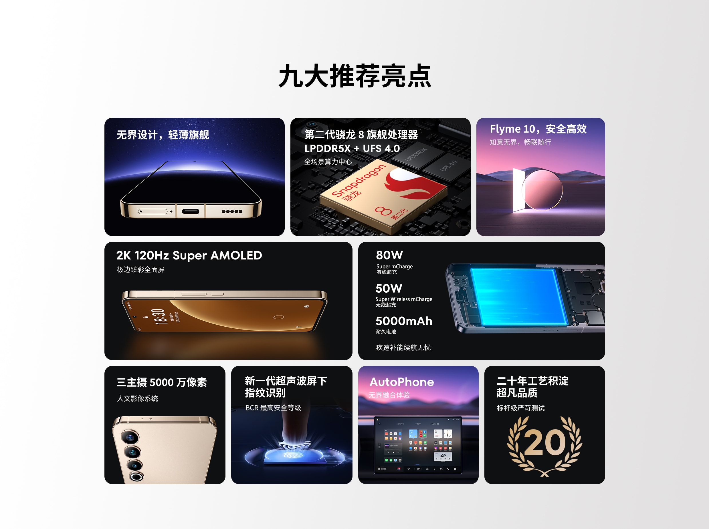 【支付尾款请进入个人中心->我的订单,通过已支付的定金订单完成尾款支付】无界设计 轻薄旗舰 | 第二代骁龙 8 旗舰处理器 | Flyme 10 安全高效 | 6.81英寸 2K120Hz Super AMOLED | 80W有线超充+50W无线超充 5000mAh耐久电池 | 三主摄 5000万像素 | 新一代超声波屏下指纹识别 0.075s极速解锁 | 以旧换新 补贴满溢 去估价>>