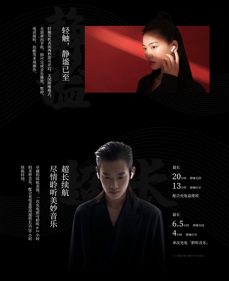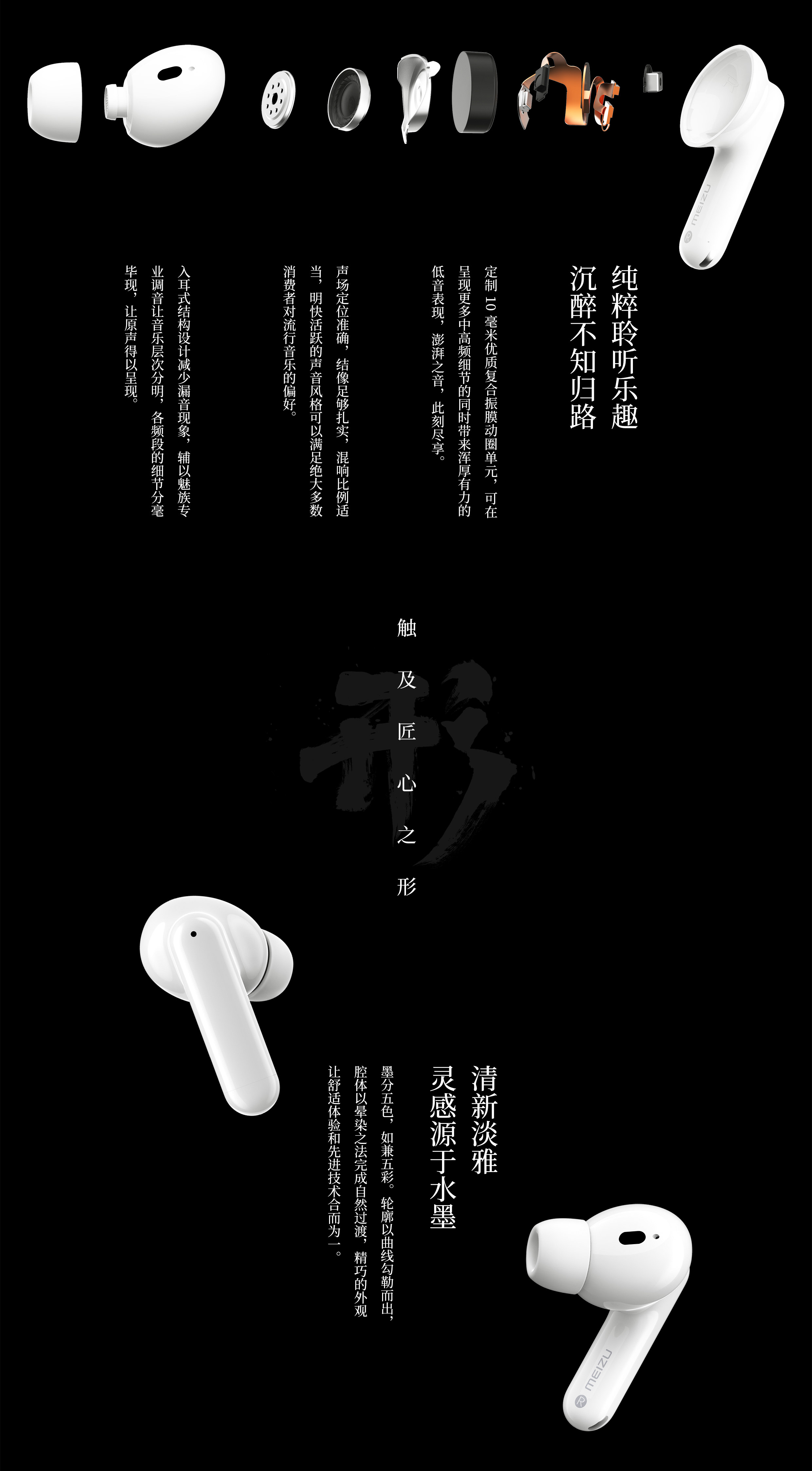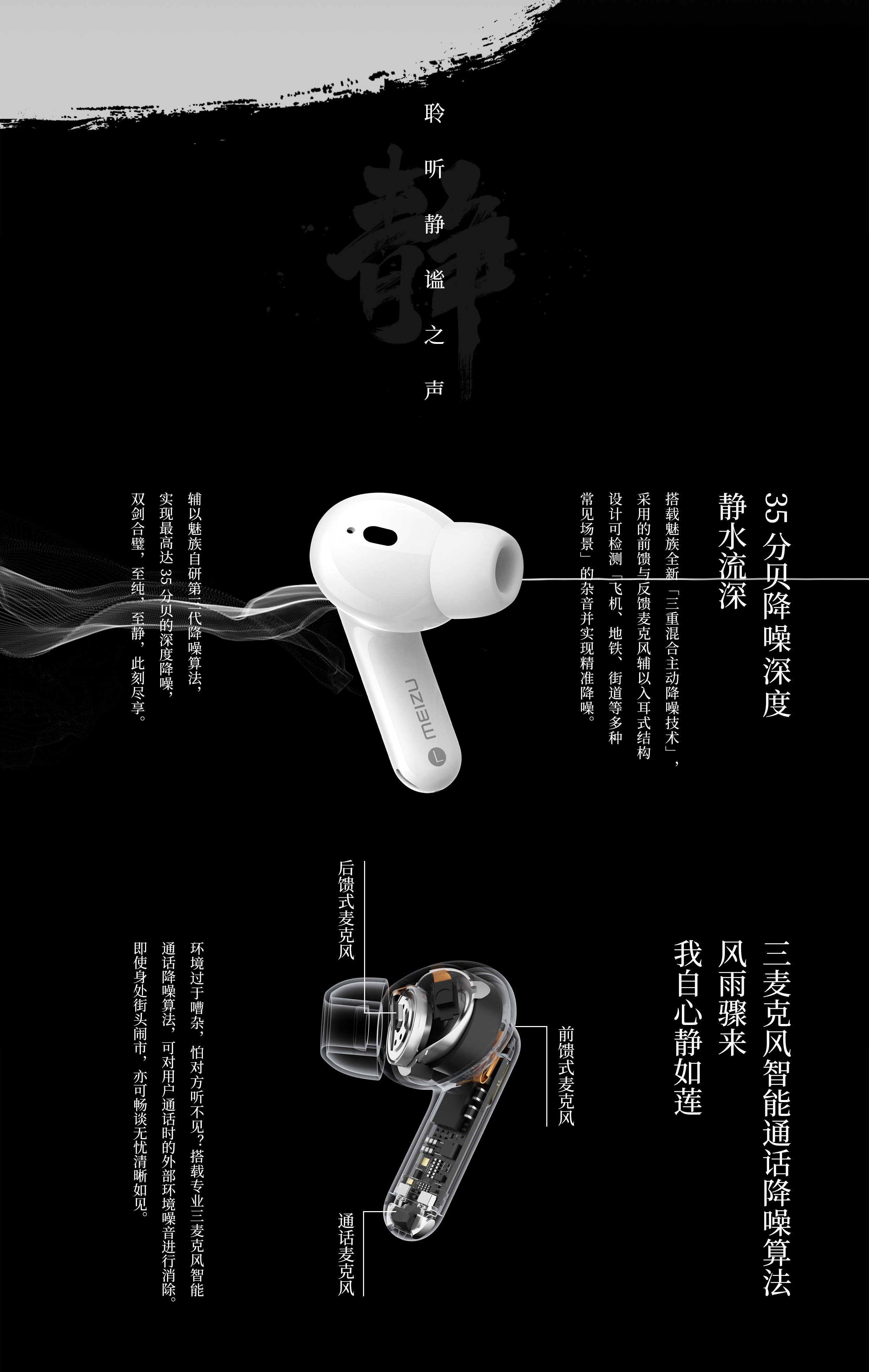 三重混合主动降噪技术 | 三麦克风智能通话降噪 | 优质复合振膜动圈单元 | 晕染构造自然腔体曲线 | Flyme 妙连高效极速配对 | 智能红外传感器使用检测