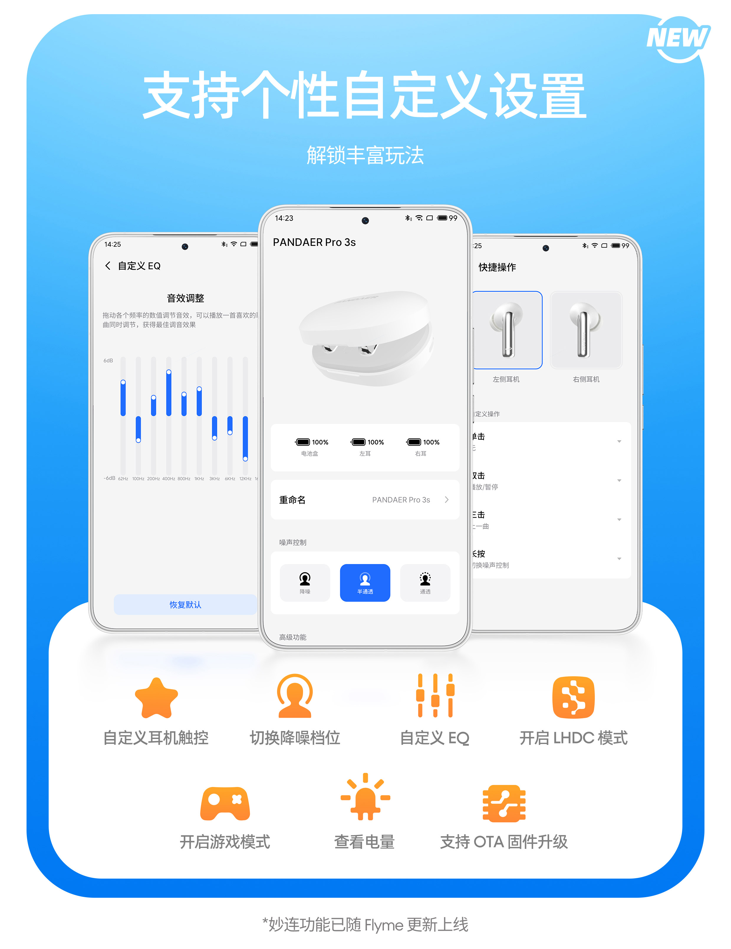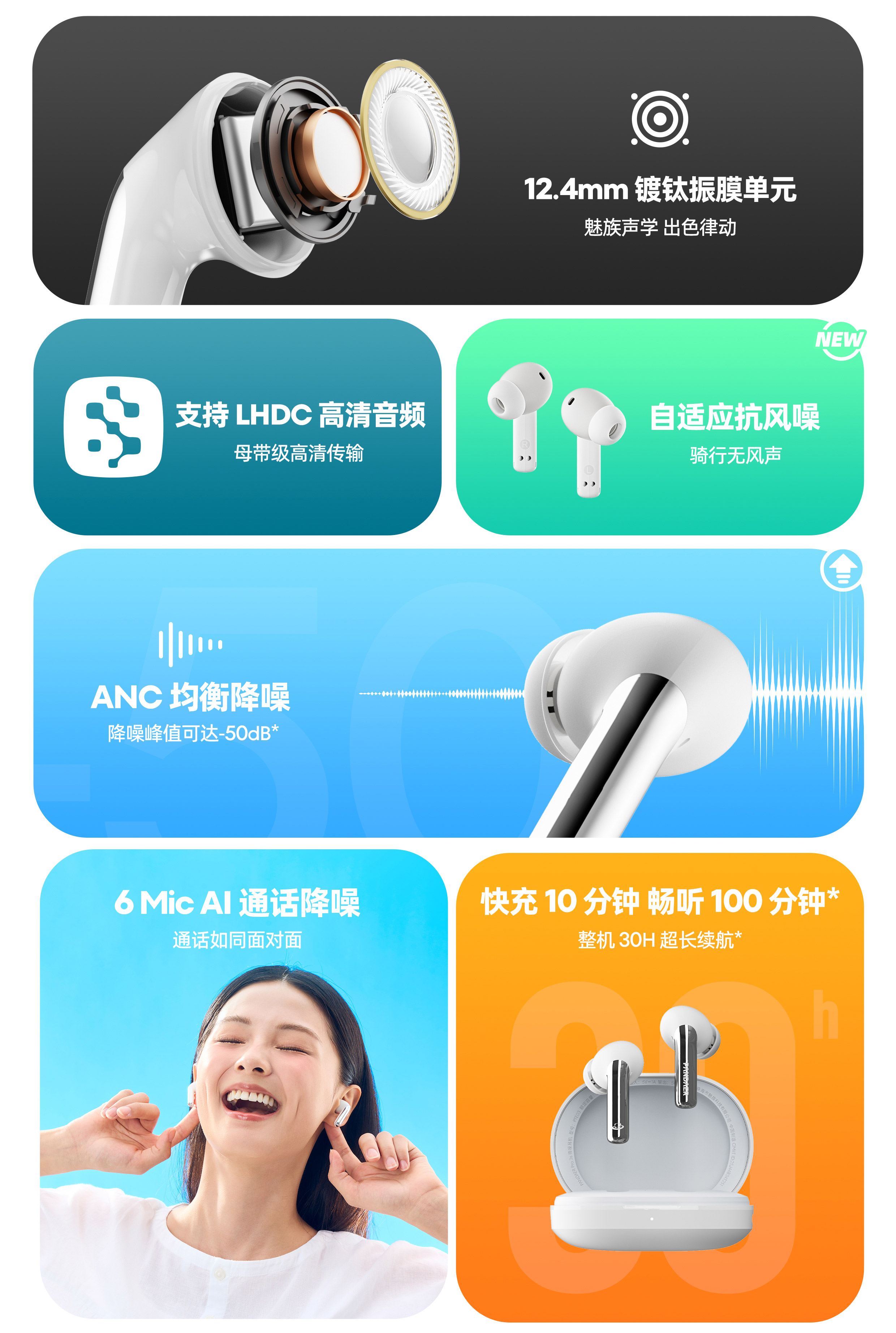 12.4mm 镀钛振膜单元 | 支持 LHDC 高清音频 | ANC 均衡降噪 | 搭配魅族耳机 APP | 自适应抗风噪